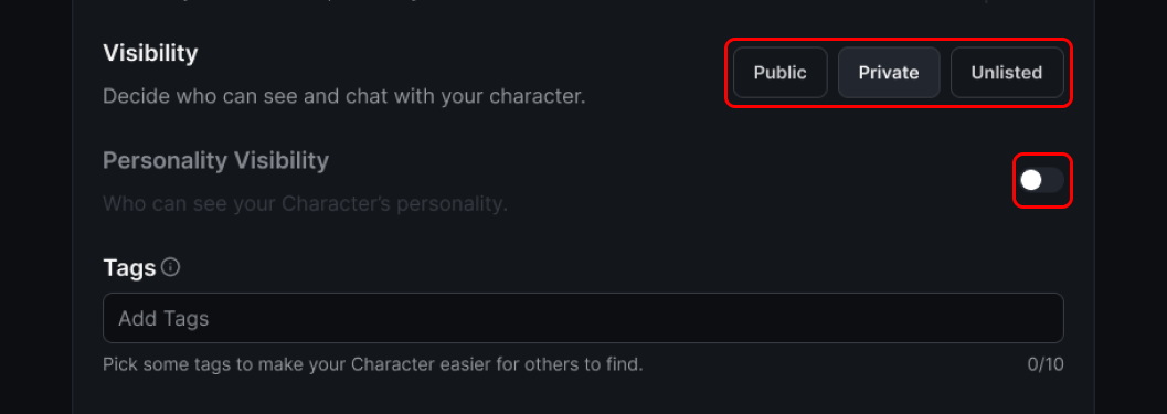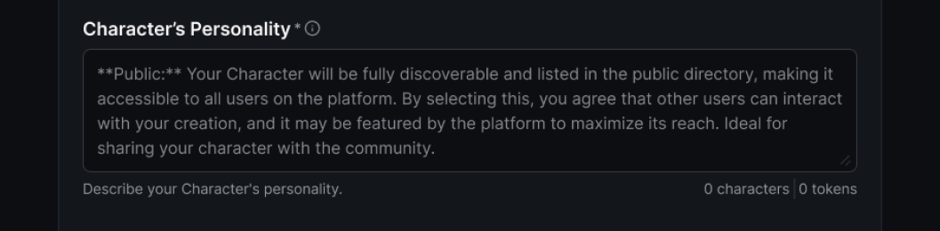 - Personality Visibility: Want to let people know more about your creation? Turn on Personality Visibility and let them start explore your character.
