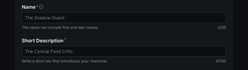 - Short Description: Think of this as your character's tagline. It appears in search results and helps users understand your character’s vibe at a glance—like "The Cynical Food Critic" or "Runaway Android Seeking Freedom".