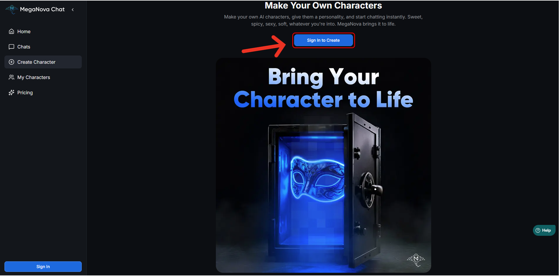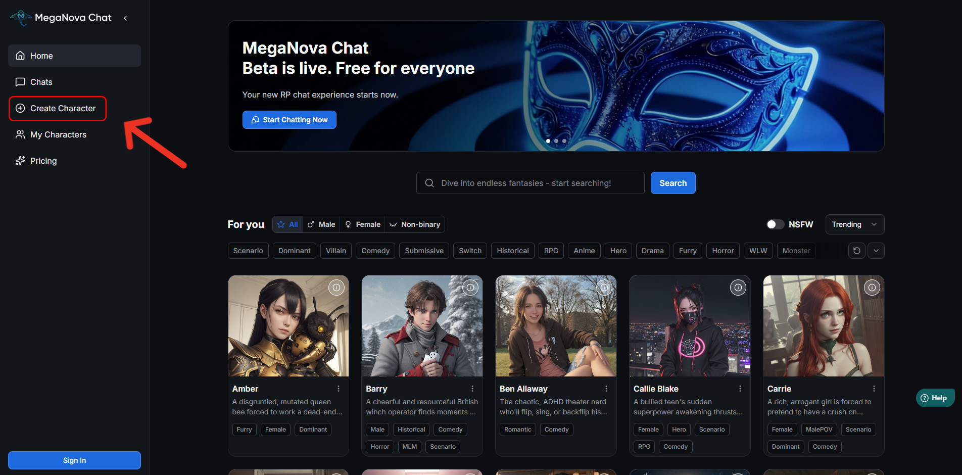 Jump into our MegaNova Chat website and choose Create Character to start personalizing your AI roleplay experience.