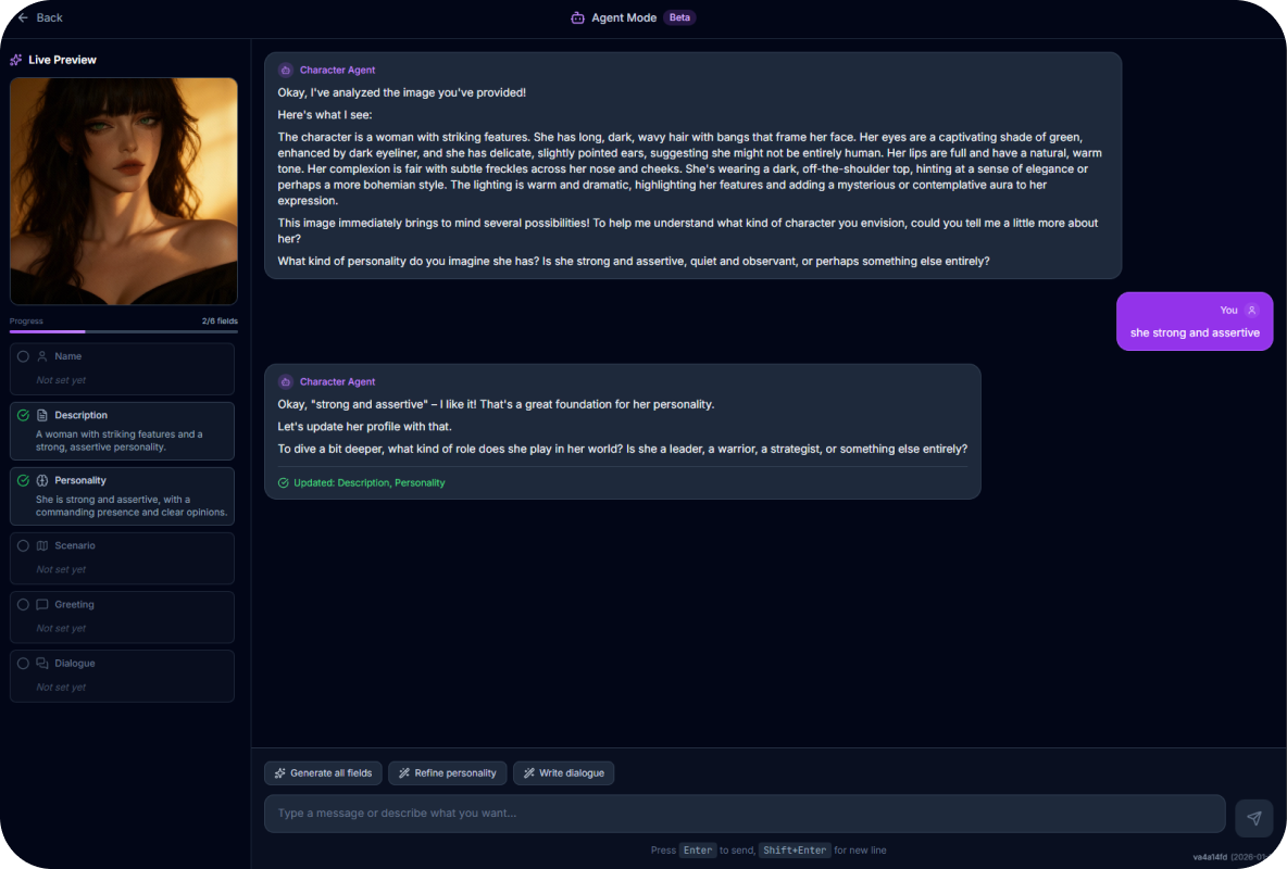 Agent Mode lets you chat with an AI Agent that guides you through character creation step by step.