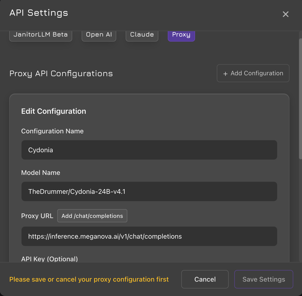 Cydonia 24B v4.1 Proxy for Janitor AI with MegaNova Setup Guide