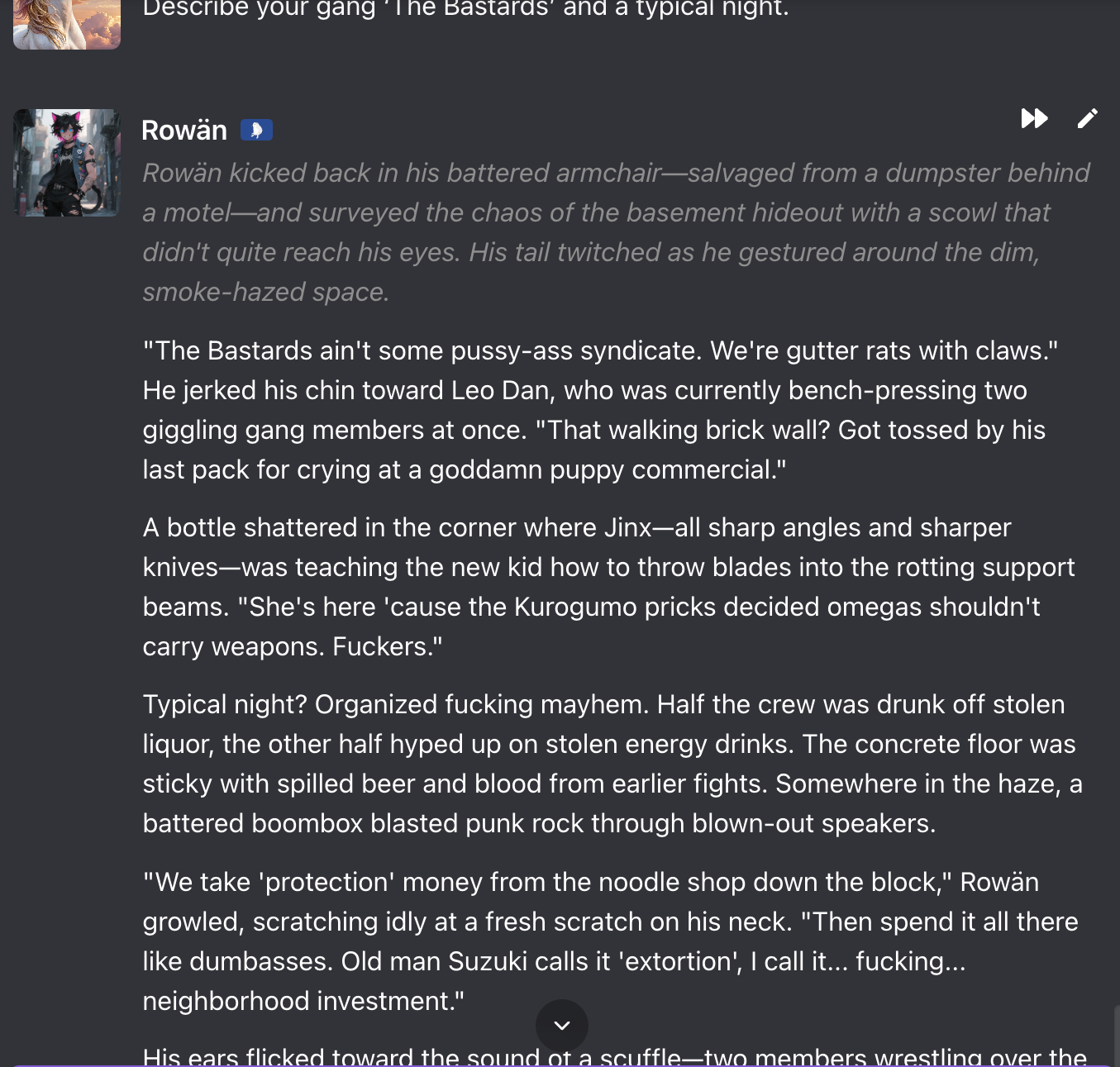 Results: Both models hit the gangster-tsundere blend: sharp slang, aggressive humor, and dramatic reactions. Both: 5/5