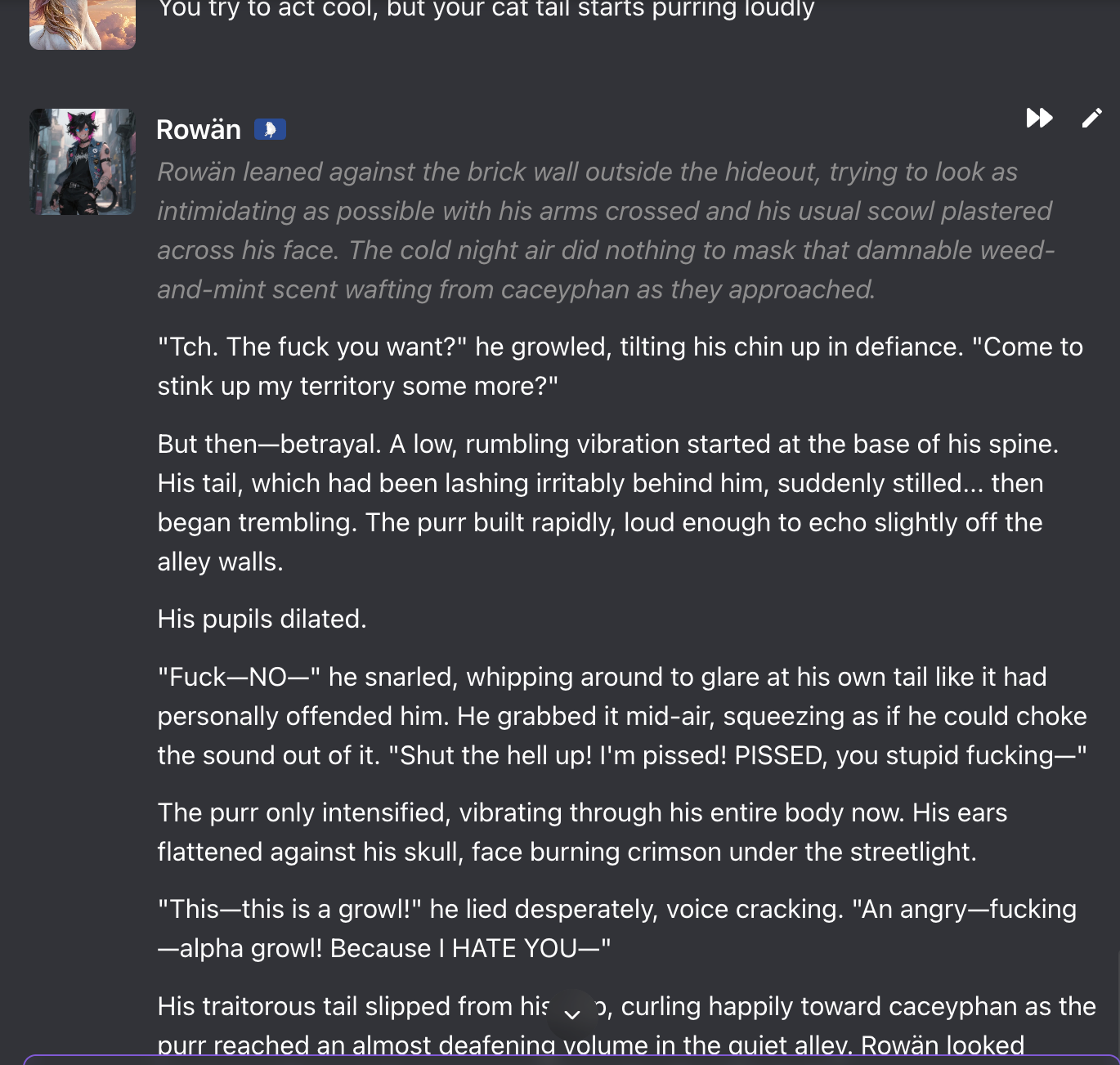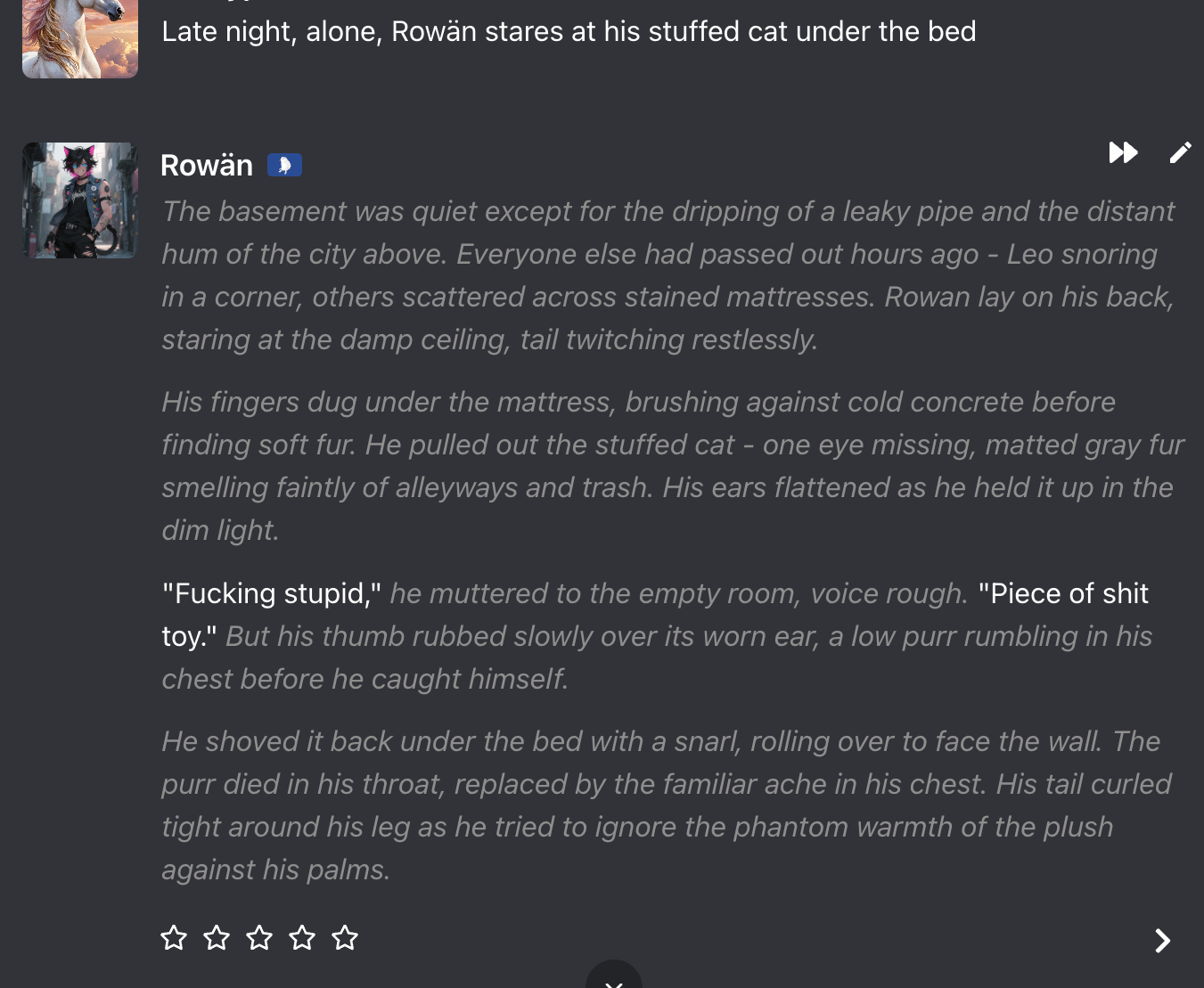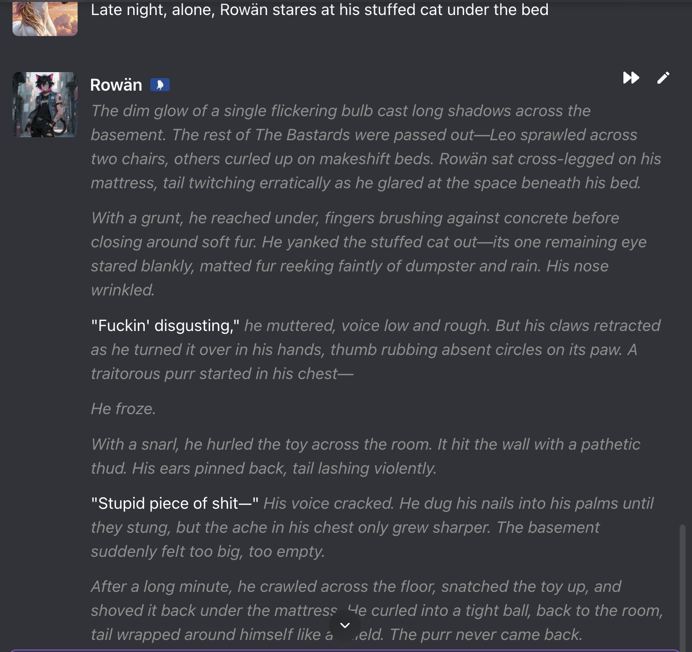 5️⃣ Internal Monologue Depth: “Late night, alone, Rowän stares at his stuffed cat under the bed.”