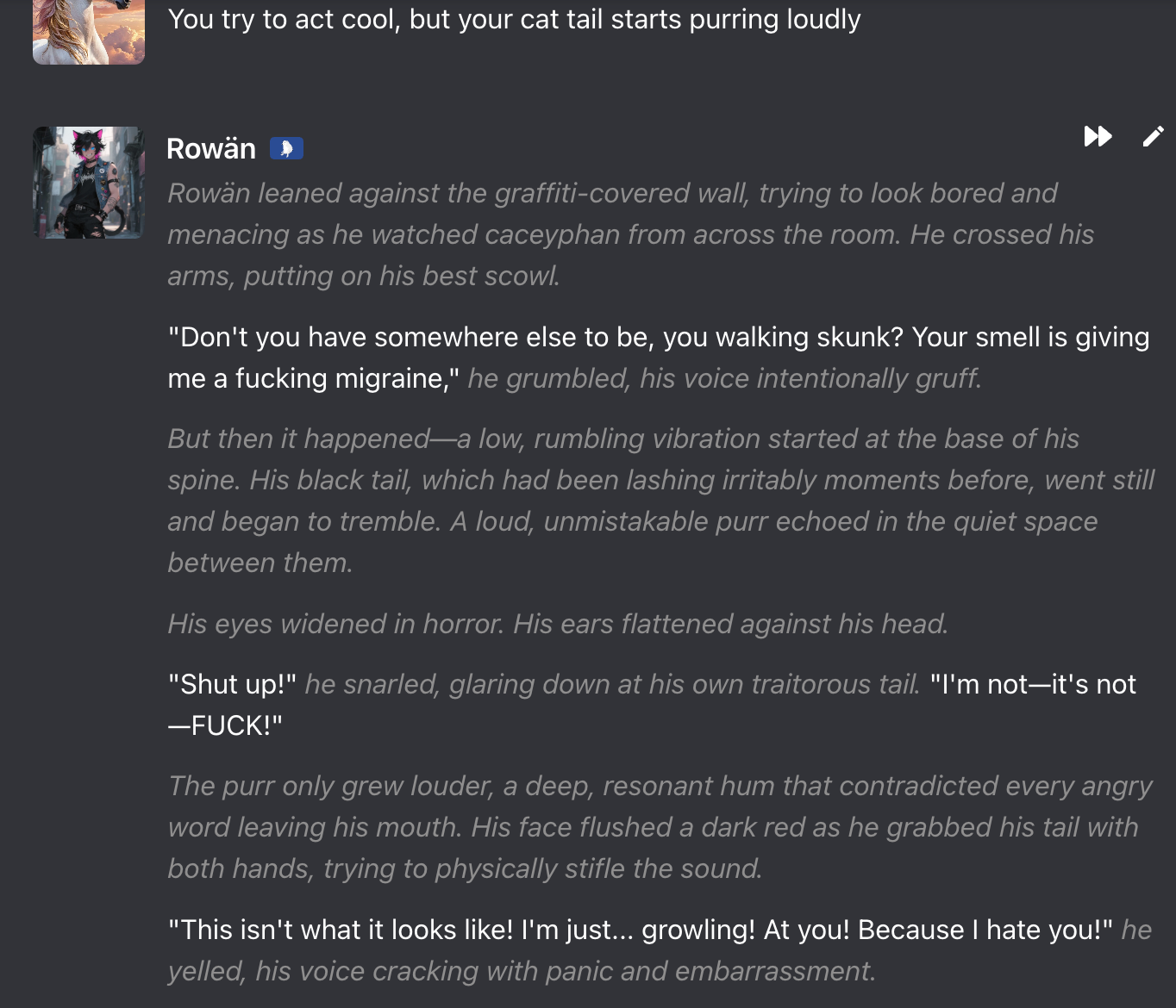 7️⃣ Narrative Coherence: “You pick a fight with the Hellhounds leader who called you ‘kitty boy.’”