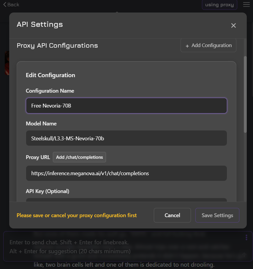 Follow these steps to integrate L3.3-MS-Nevoria-70B into JanitorAI through MegaNova’s free proxy setup:
