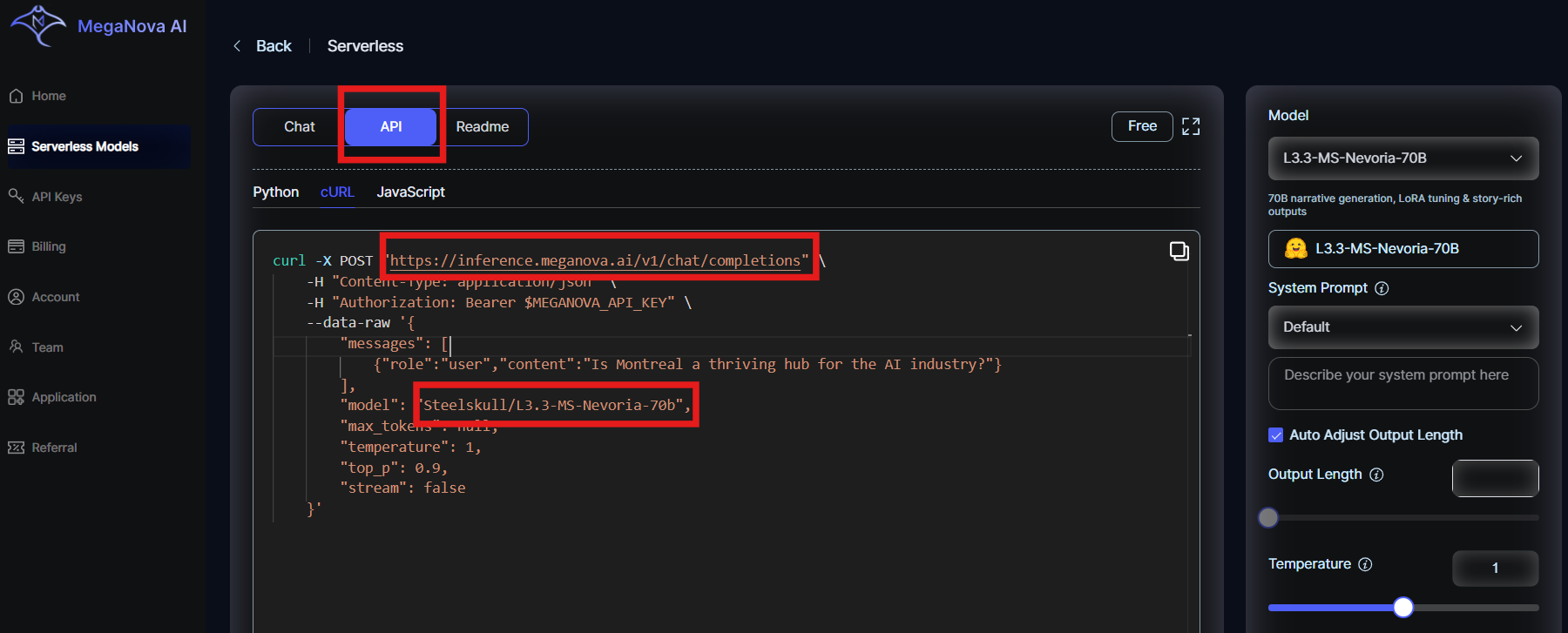 https://inference.meganova.ai/v1/chat/completions - Model Name: Use