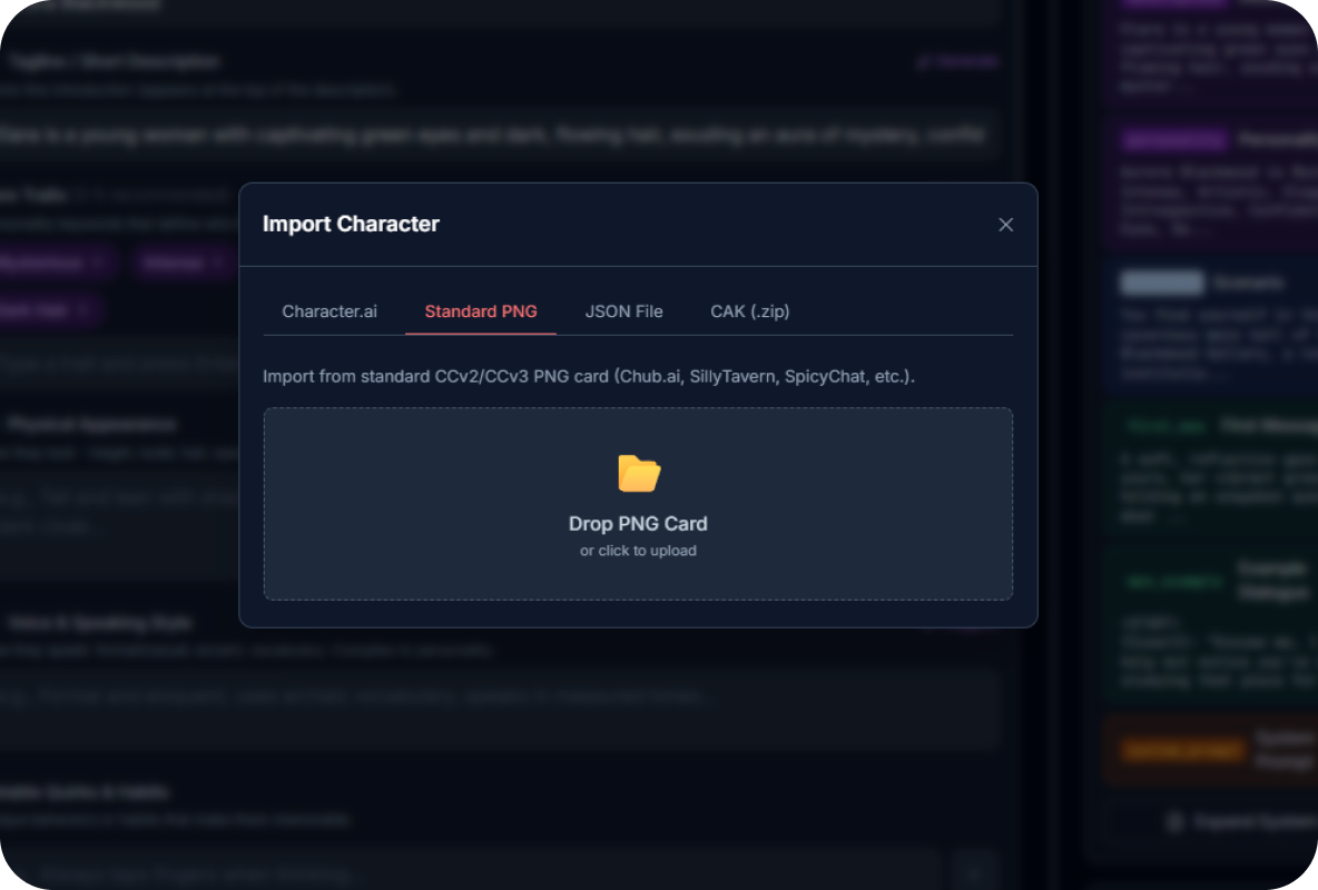 Instead of filling out forms, you chat with an AI agent that asks questions, reacts to your ideas, and helps you shape the character collaboratively. You describe intentions, tone, personality, and story, the AI helps structure and refine them.