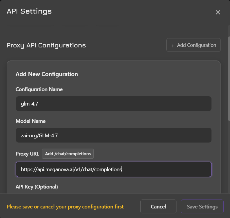 Note: If you are upgrading from 4.6, simply change the model name to "glm-4.7". - Proxy URL: https://api.meganova.ai/v1/chat/completions.