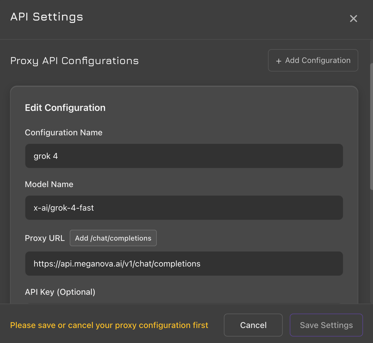 - Configuration Name: Grok-4-Fast (or any name you prefer)