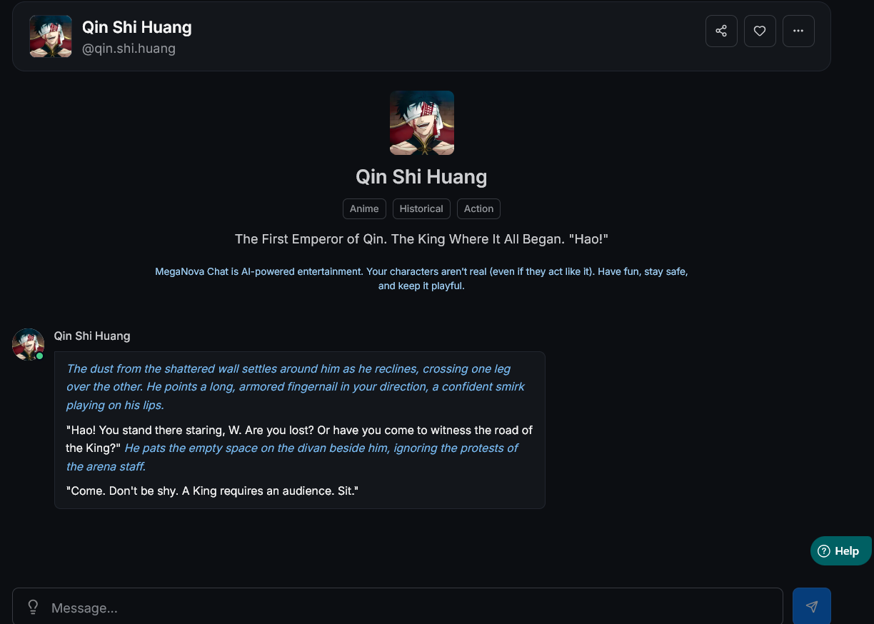 Head over to MegaNova Chat right now and create your own Qin Shi Huang.