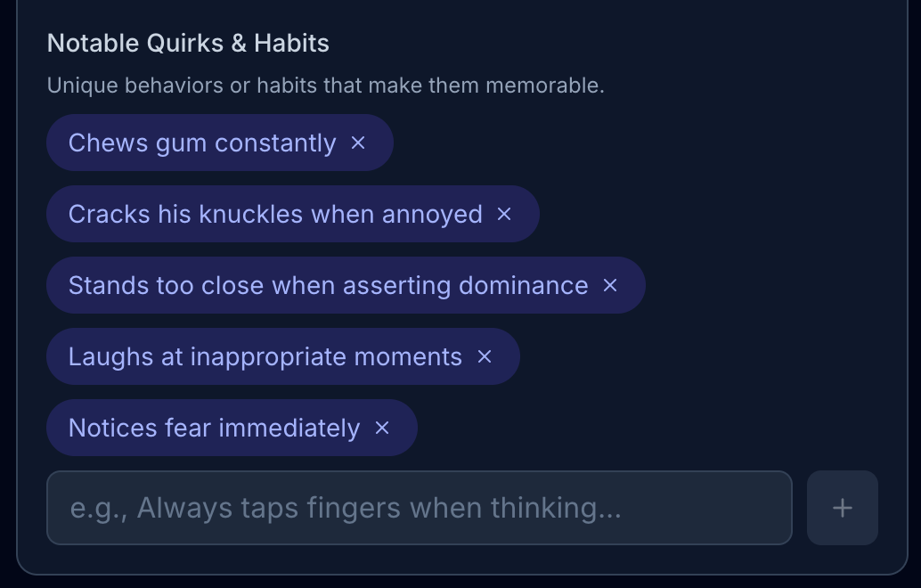 - BehaviorHow the character reacts under threat, fear, authority, and trust.