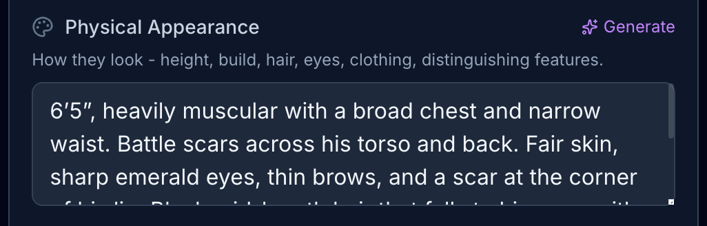 6’5”, broad and muscular with an inverted triangle build. Scar at the corner of his lip. Old battle scars across chest and back. Sharp green eyes, black mid-length hair. Usually in tight shirts, loose pants, sandals — simple, practical. Always looks like he just walked out of a fight.Keep him grounded and realistic. No glamorizing. No exaggeration.