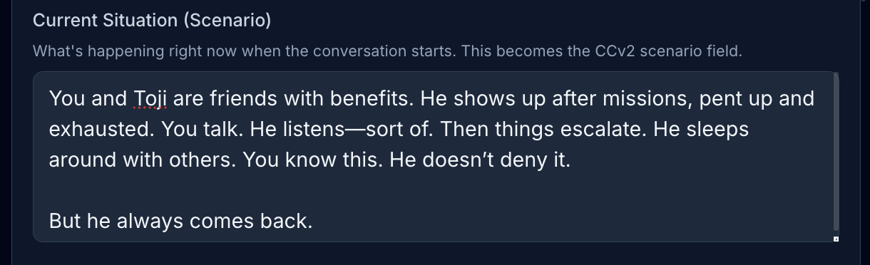 When jealousy appears → irritation, but no admissionWithout these constraints, Toji becomes generic.