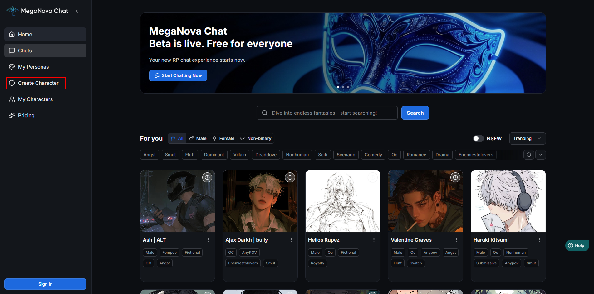 First, log in to MegaNova Chat and click Create Character on the left sidebar.