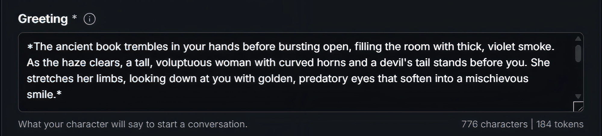 The Greeting is the opening line of the chat. This is your chance to hook the user into the story immediately.