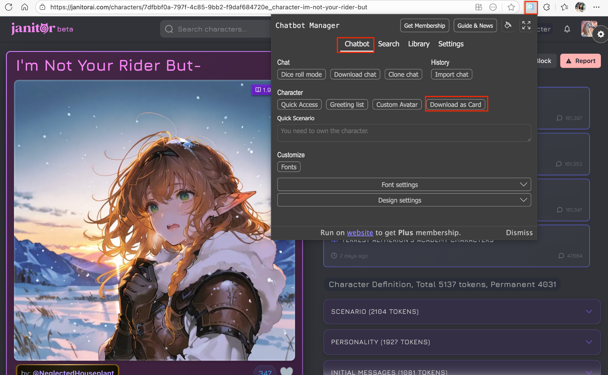 To export characters from JanitorAI, install the Chatbot Manager browser extension (Chrome or Firefox).