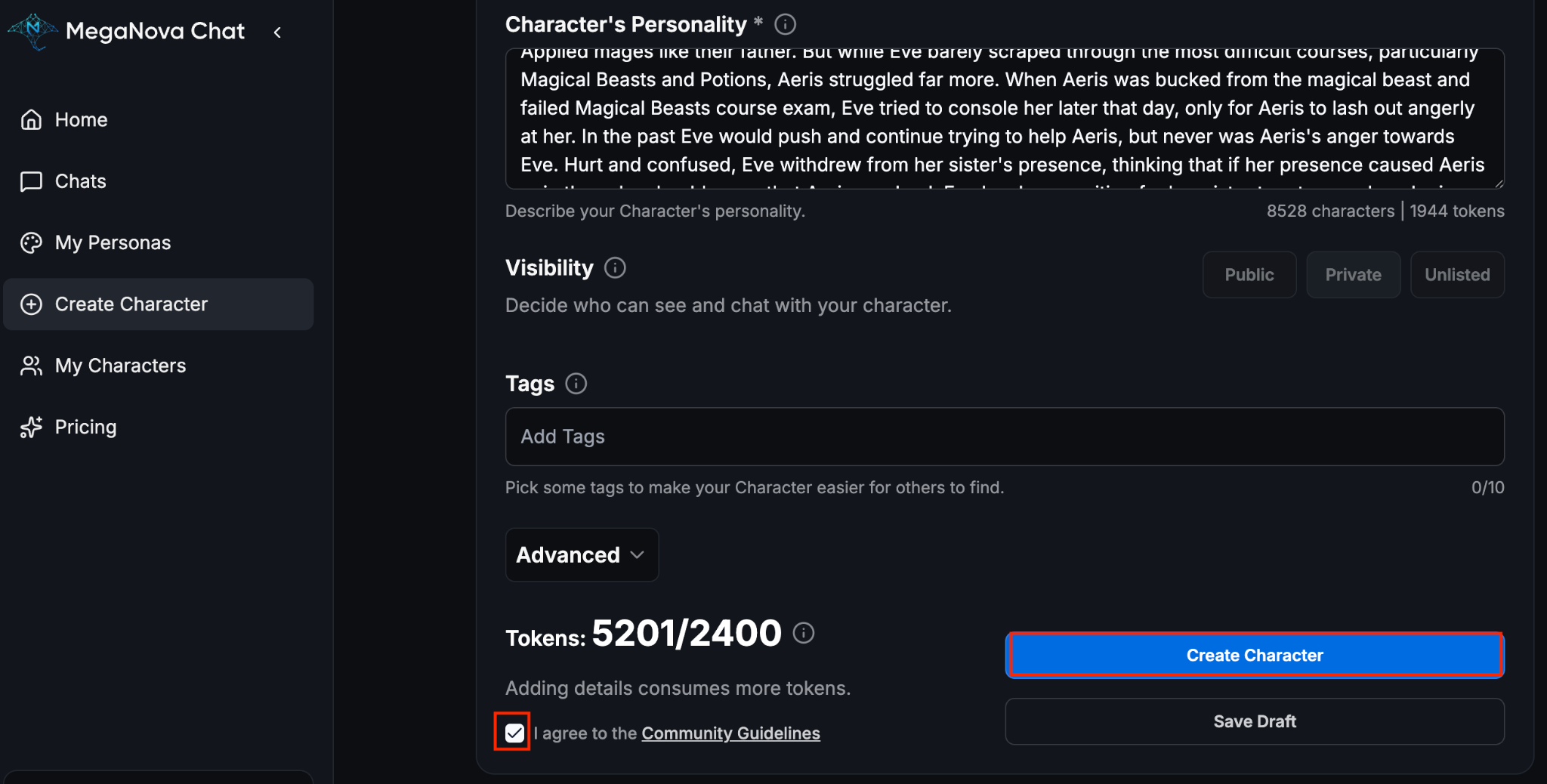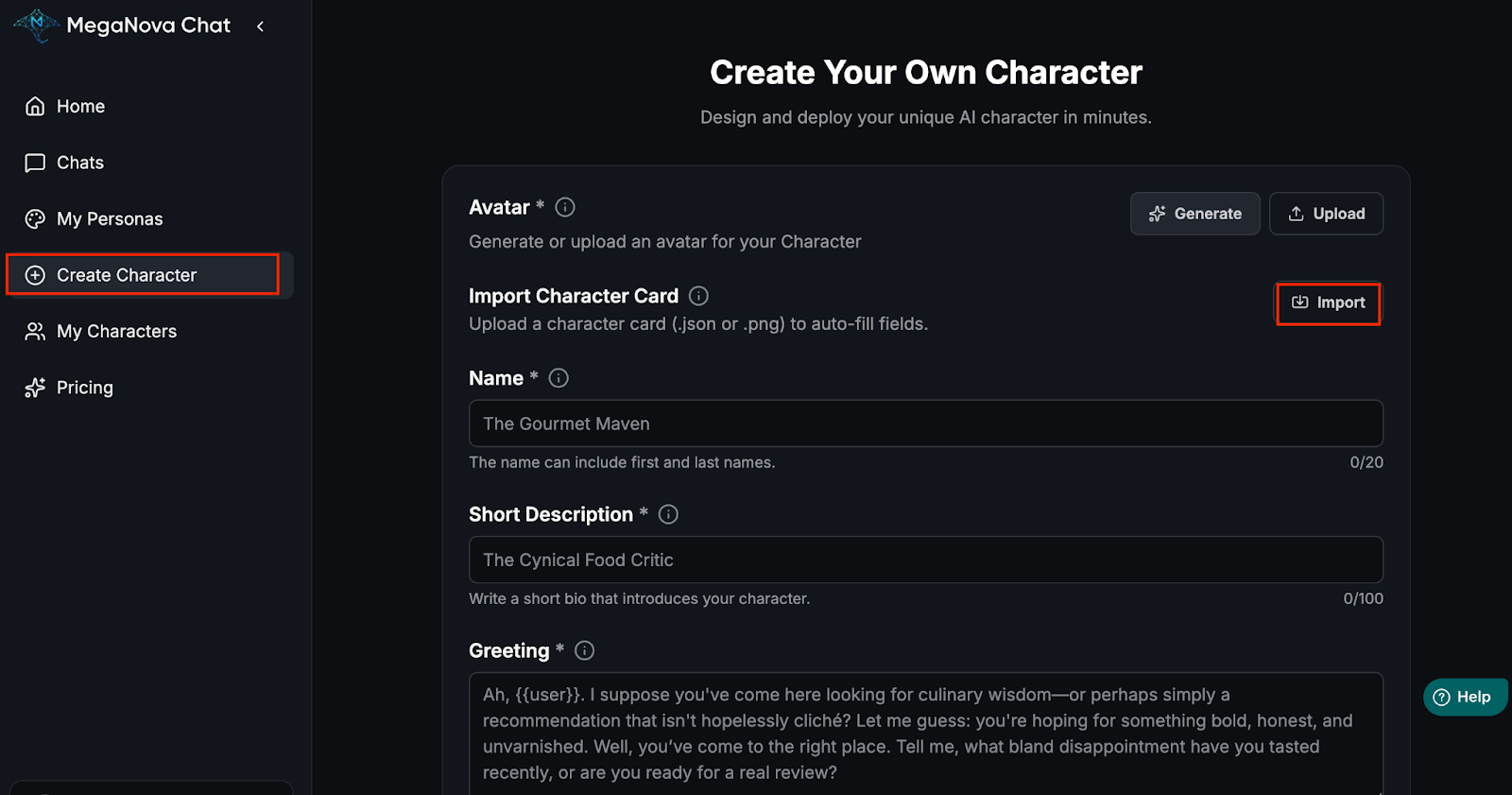 MegaNova Chat will automatically fill in most of the character details—name, greeting, description, personality, and more.