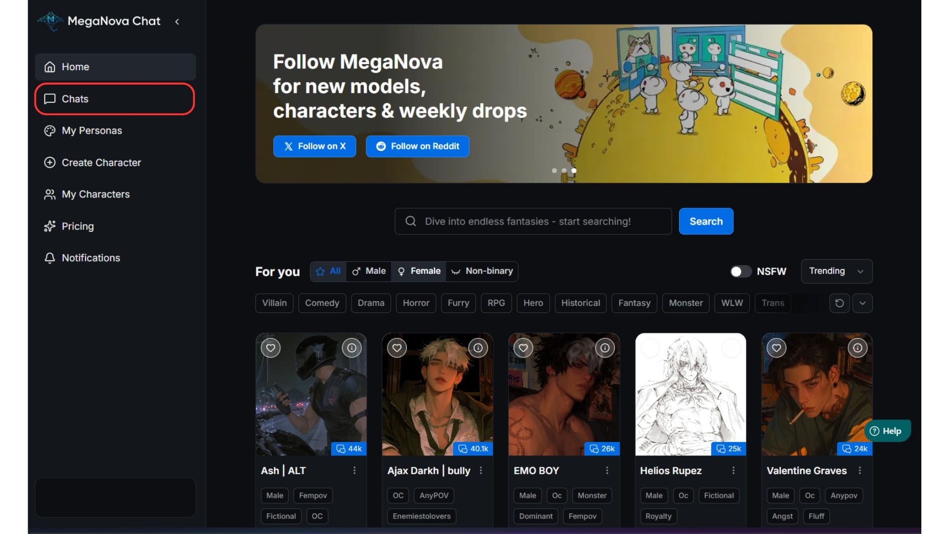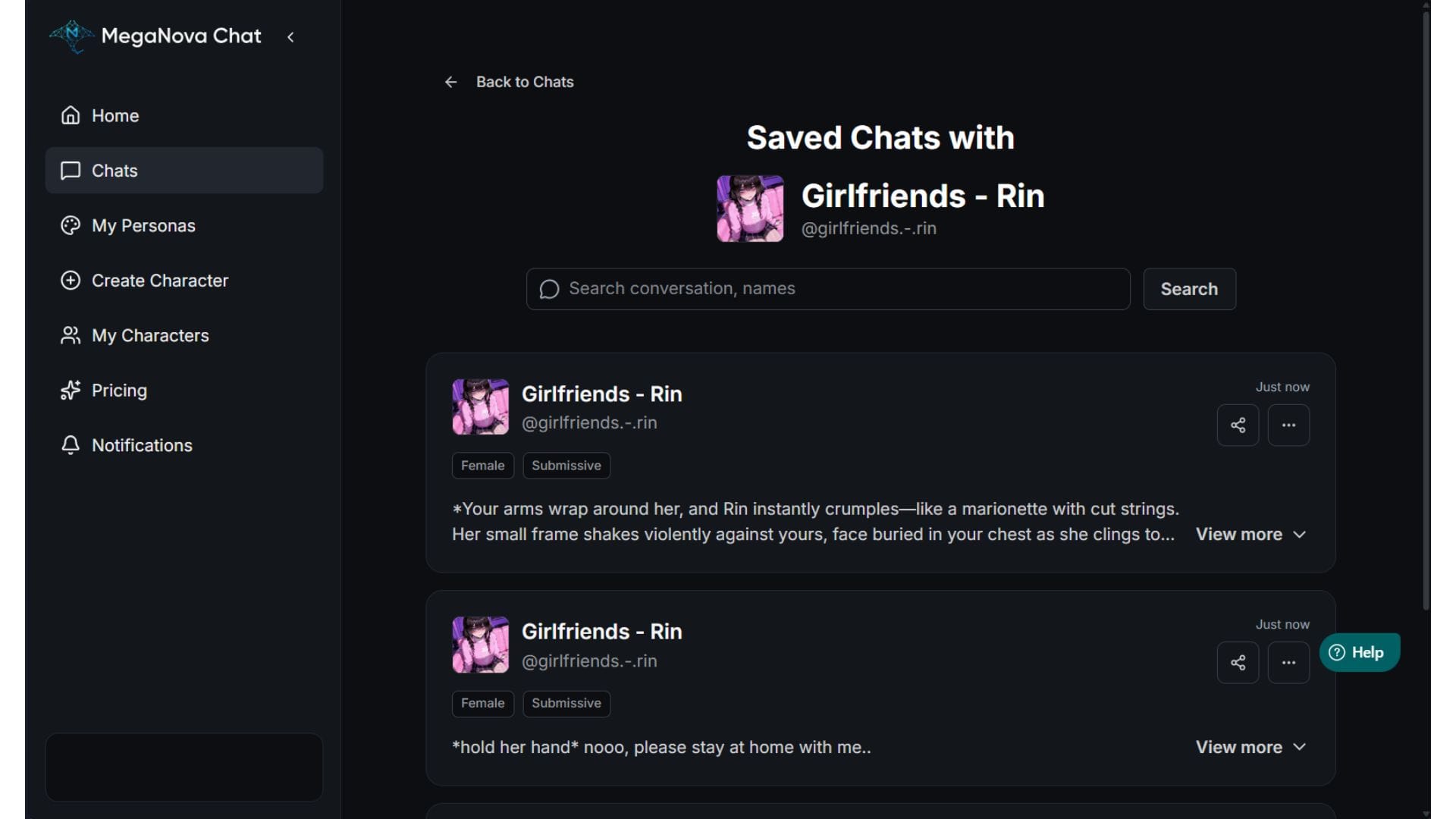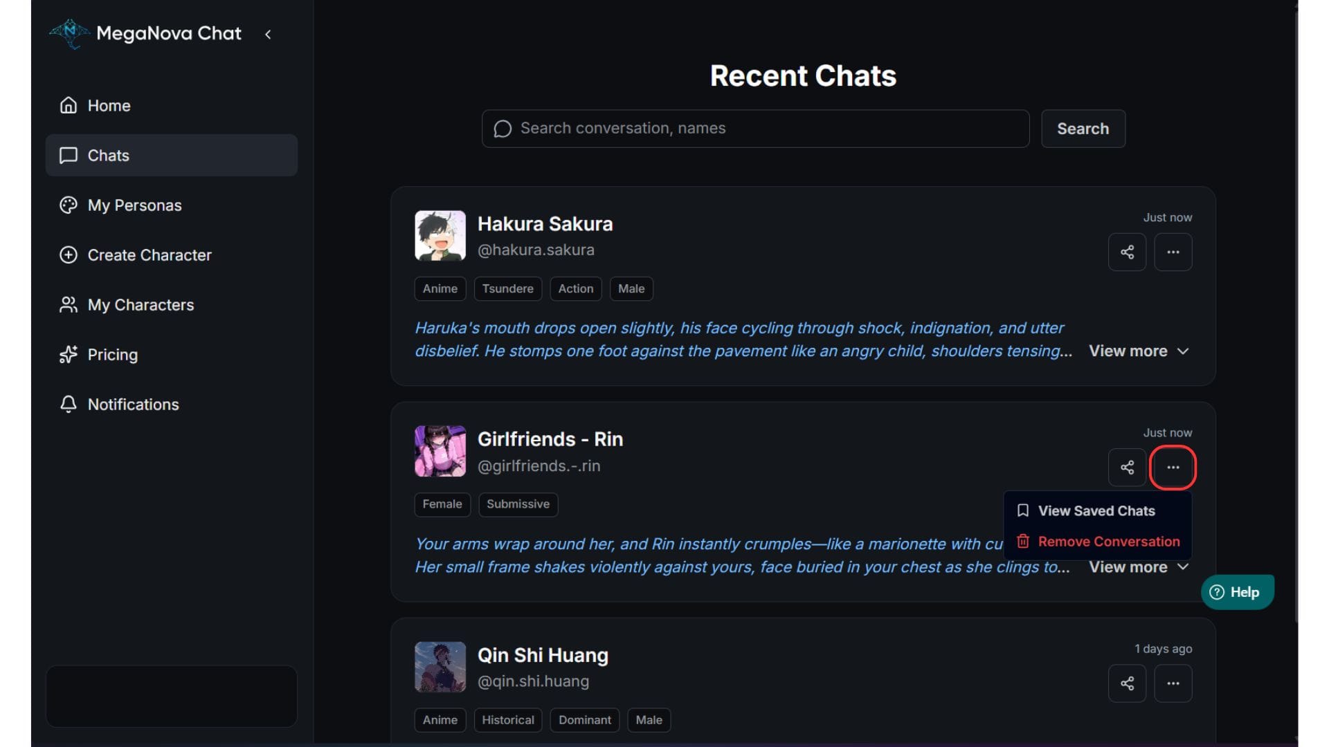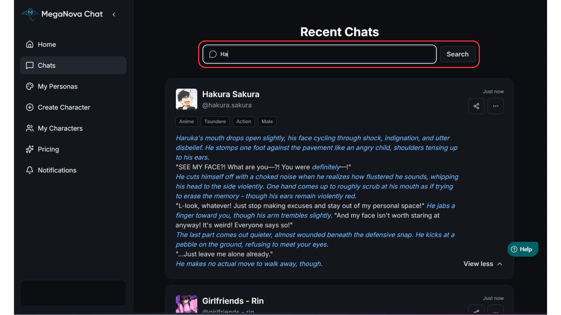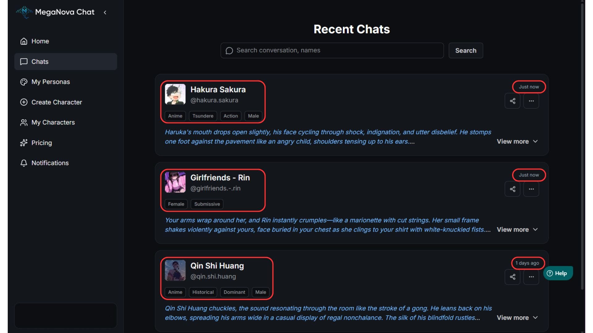 As you spend more time on MegaNova Chat, you might accumulate dozens (or hundreds!) of conversations. Finding a specific character from last month shouldn't feel like a treasure hunt.