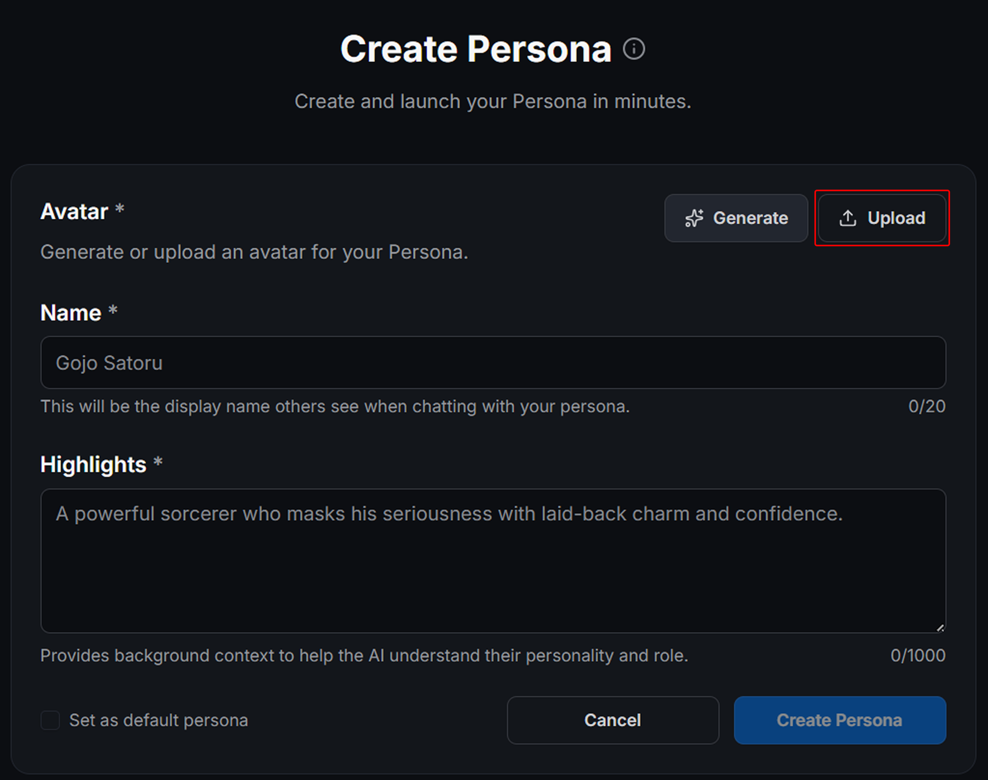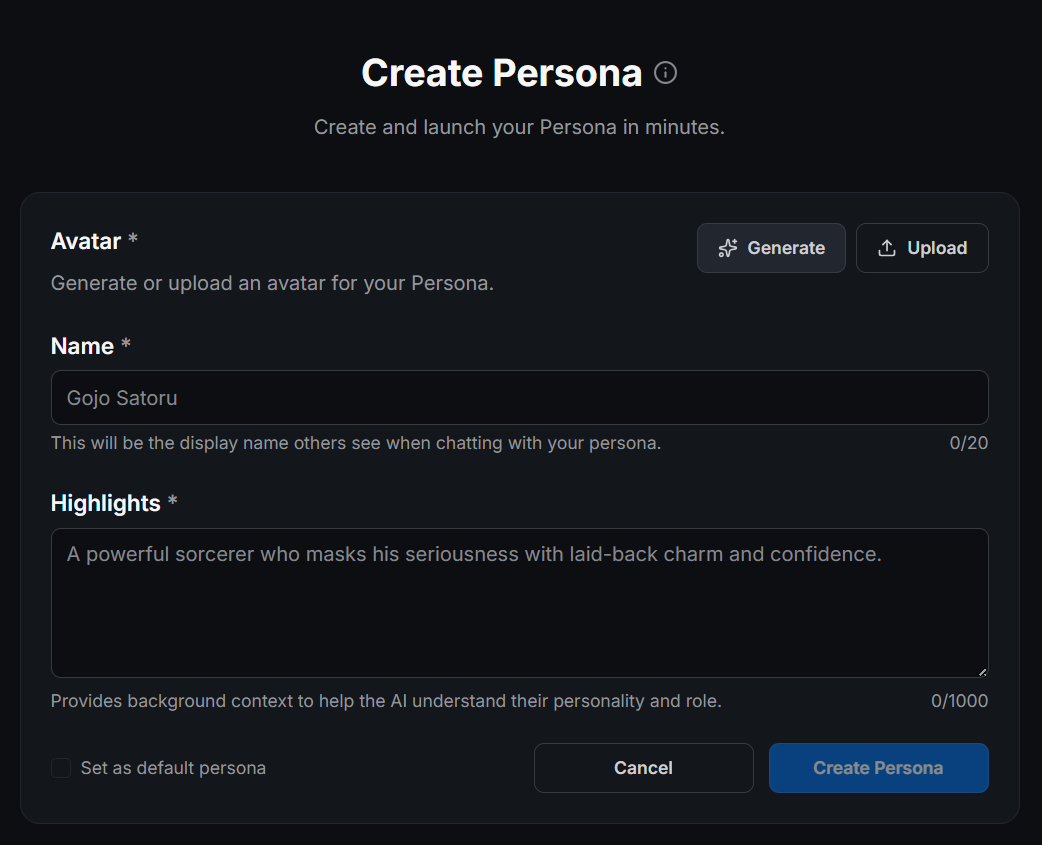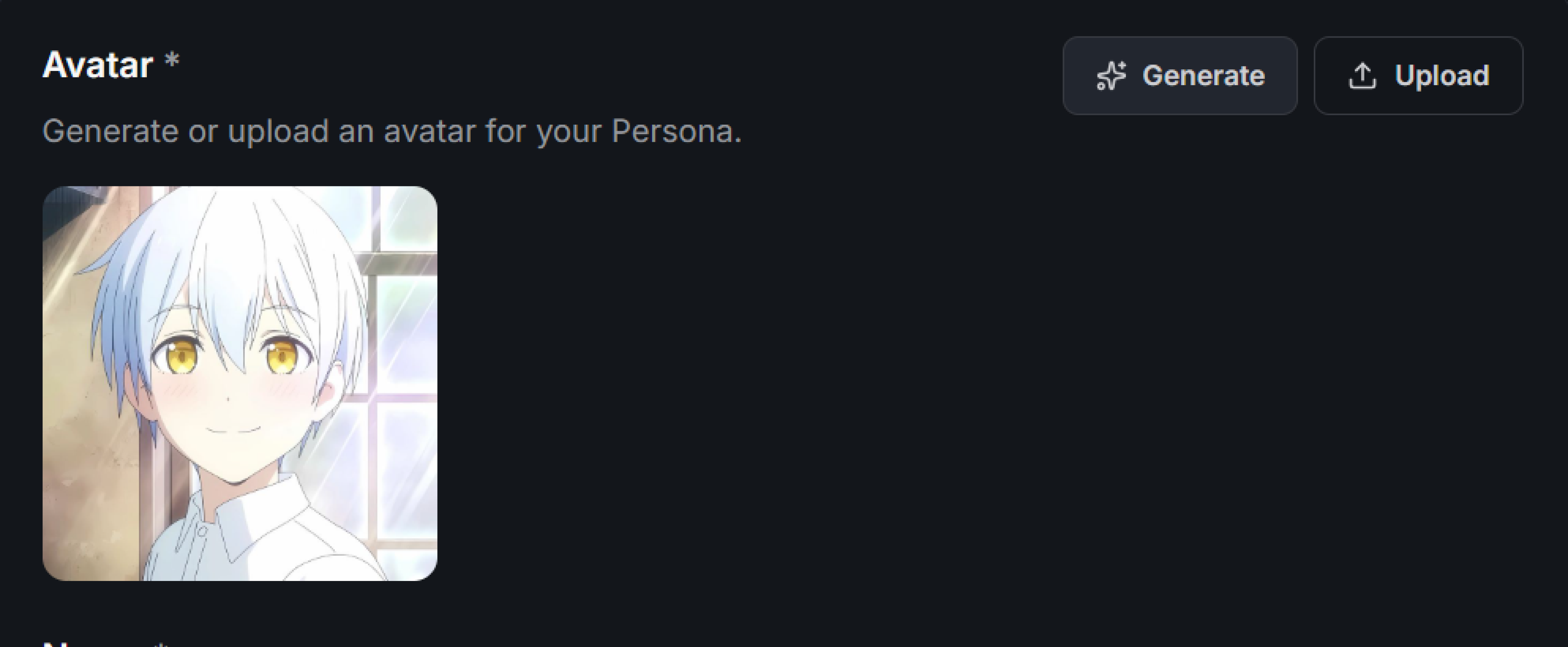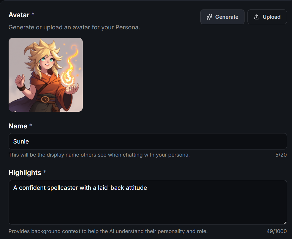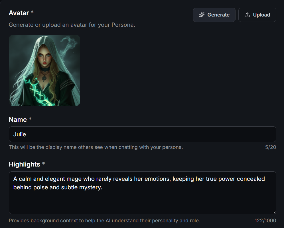 Just like your AI characters, your persona needs a face. You can generate a new image or upload one from your device. This visual representation helps ground the roleplay.