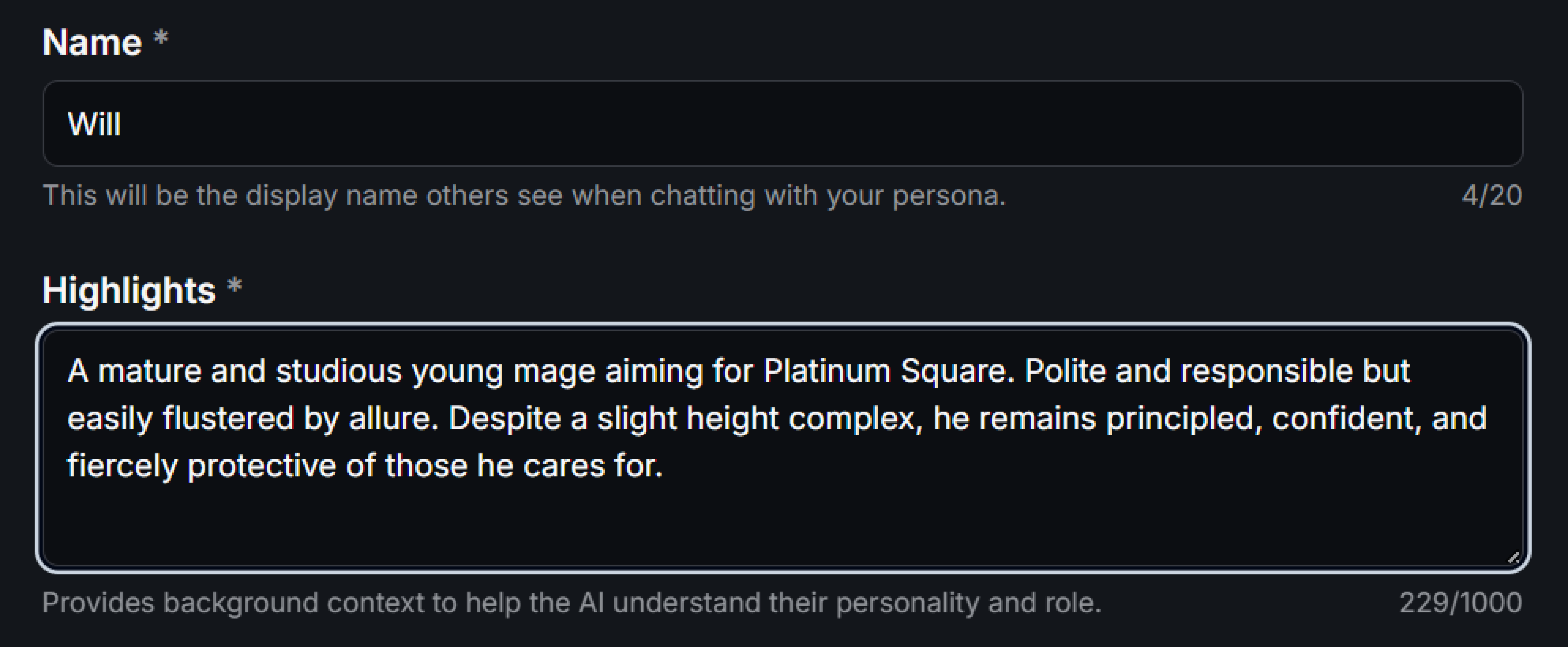 We recommend keeping your highlights between 1 and 2 sentences. This ensures the character will accurately refer to you without getting confused by too much information.