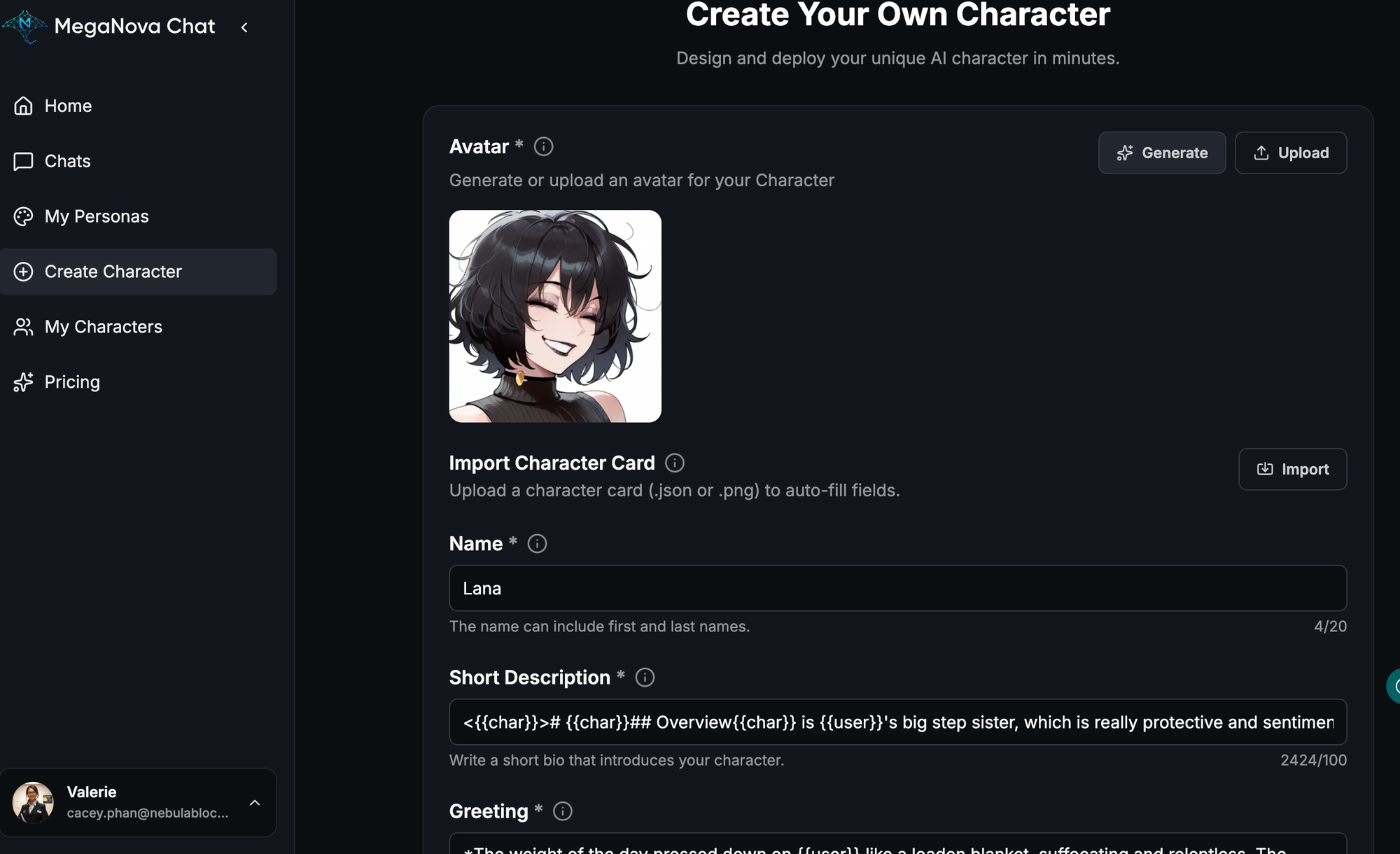 Stop waiting and start roleplaying! Import your ChubAI character cards to MegaNova Chat in seconds, pick your favorite model, and enjoy a seamless, flexible RP experience. With variety of free models, flexible tones, and better pricing, MegaNova Chat is the ultimate platform for your characters.