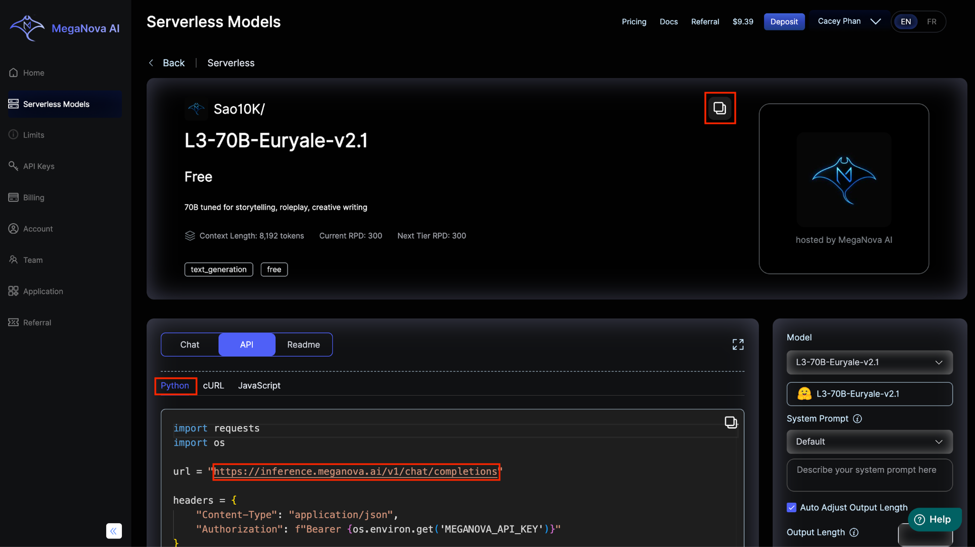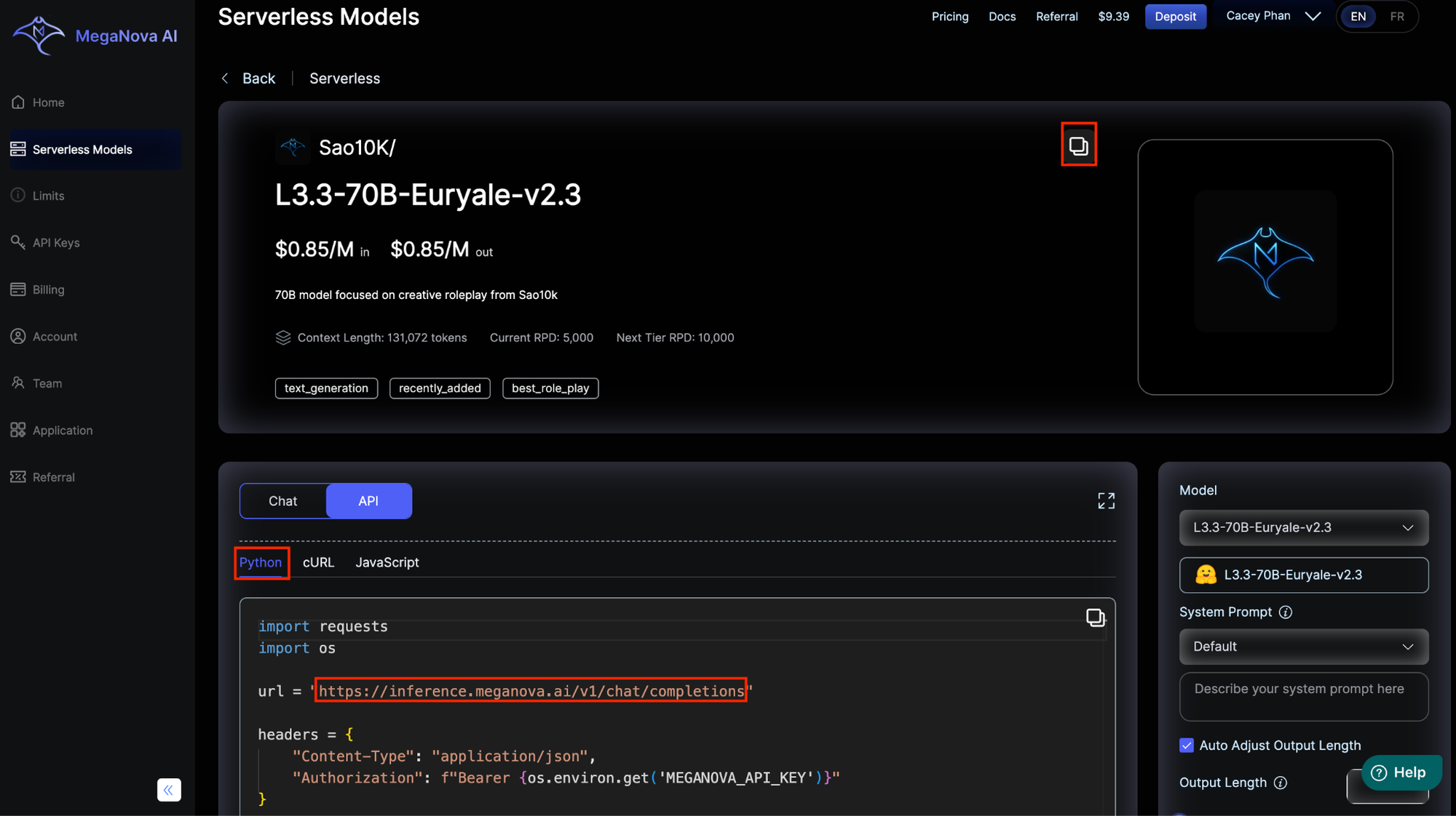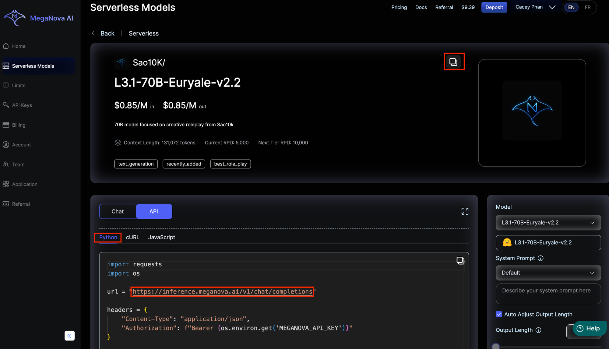 - Base URL/Endpoint: https://inference.meganova.ai/v1/chat/completions