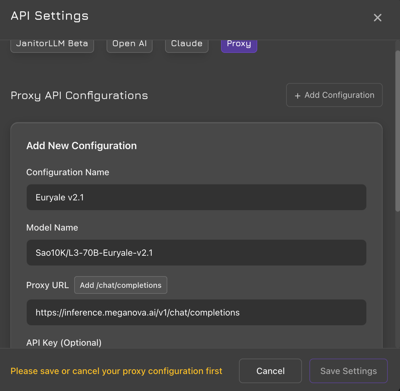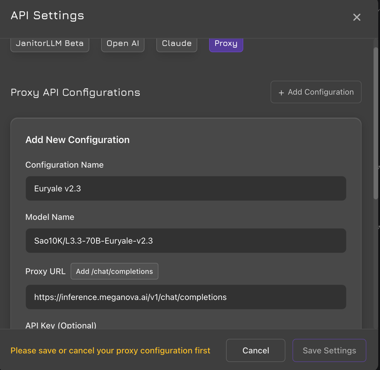 With the Euryale Series set up, you’re ready for immersive roleplay, long-context storytelling, and smarter characters on Janitor AI. Choose free v2.1 for creative flexibility, or step up to v2.2 and v2.3 for long-memory, premium RP experiences — all powered seamlessly through MegaNova AI Proxy.