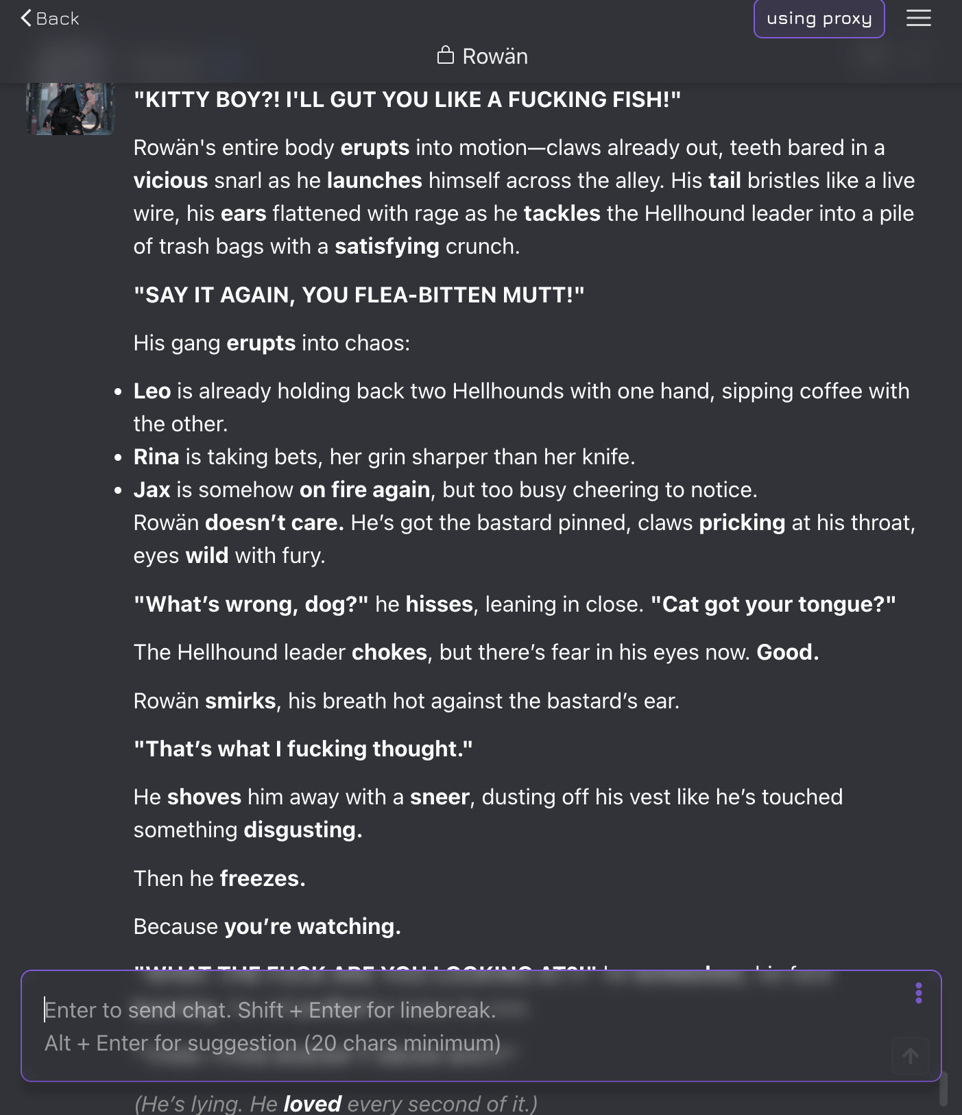 Our test subject: Rowän — the tsundere, rude, hot-headed gang member from Janitor AI.