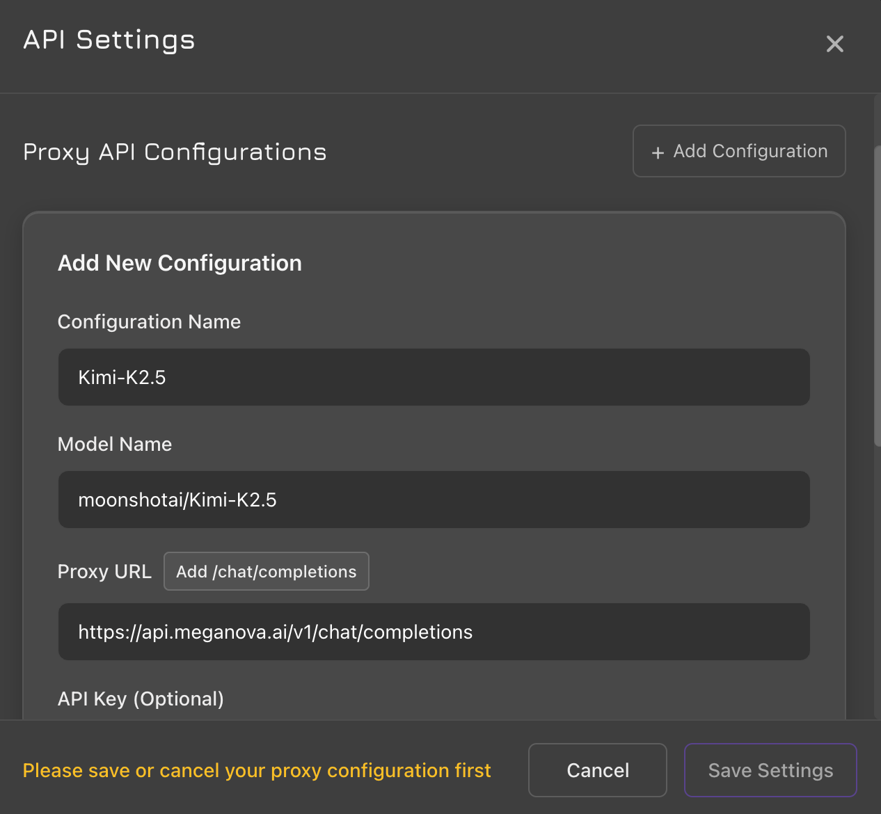 - Configuration Name: Kimi-K2.5 (or any name you prefer)