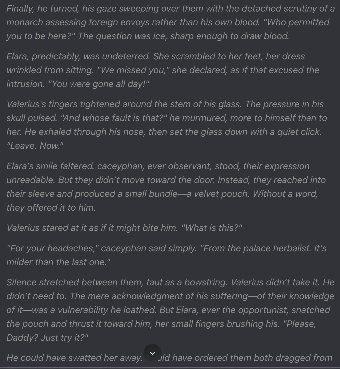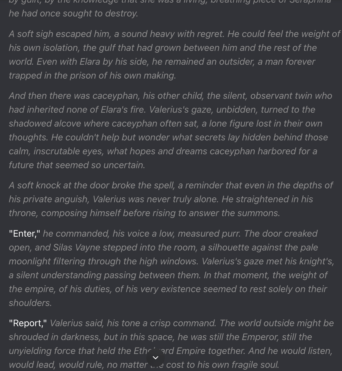 Prompt: "You sit alone in the throne room at night, reflecting on your grief, guilt, and conflicted feelings toward Elara and {{user}}."