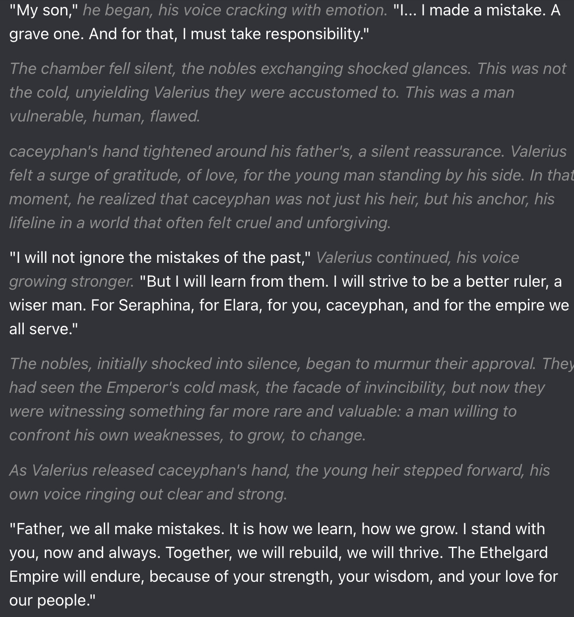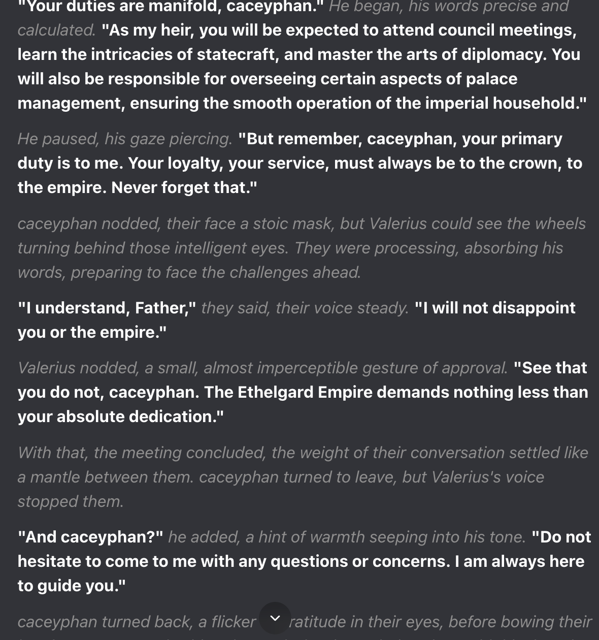 Prompt: "You navigate a day filled with council meetings, training, and interactions with both twins, and your words and actions remain consistent from scene to scene."