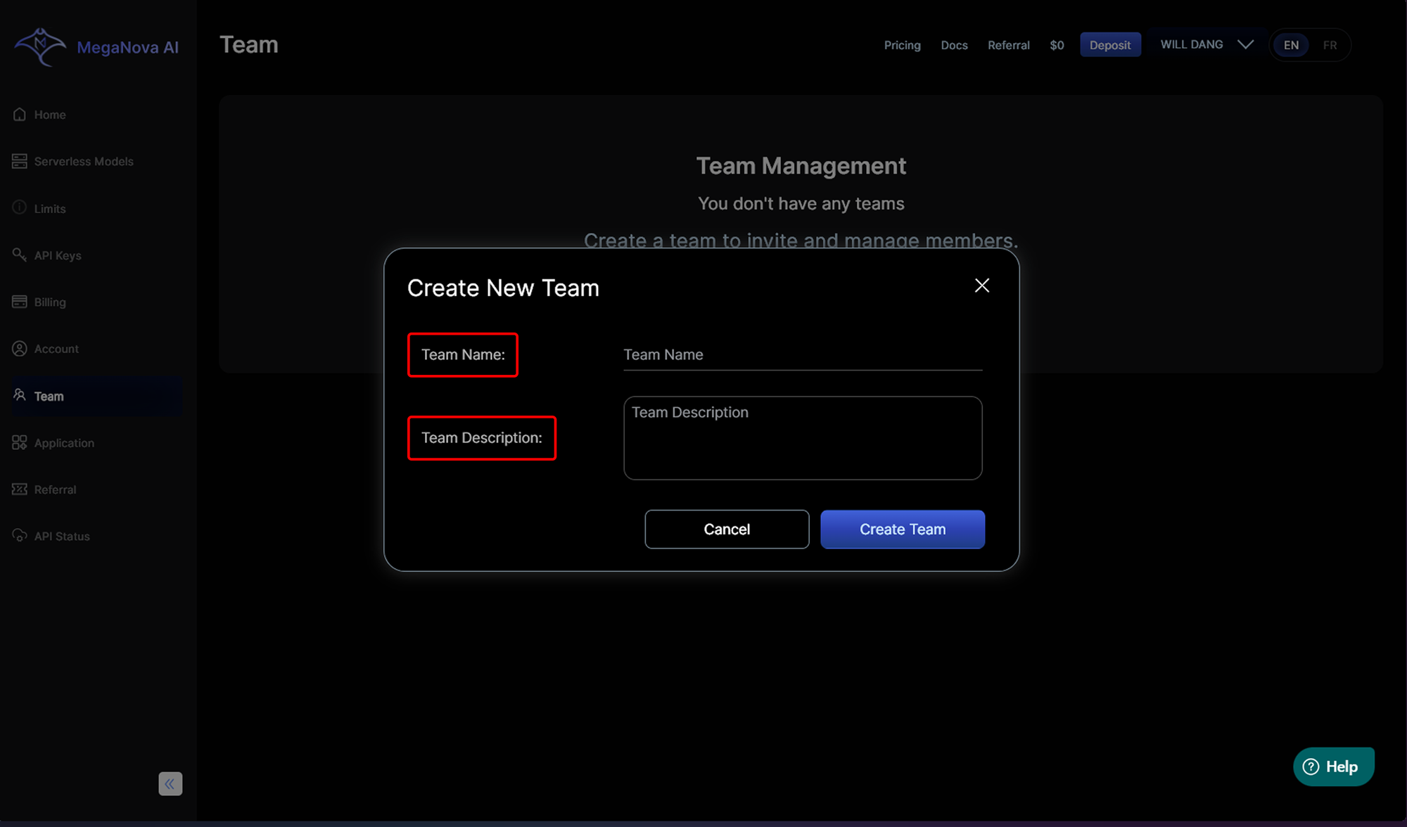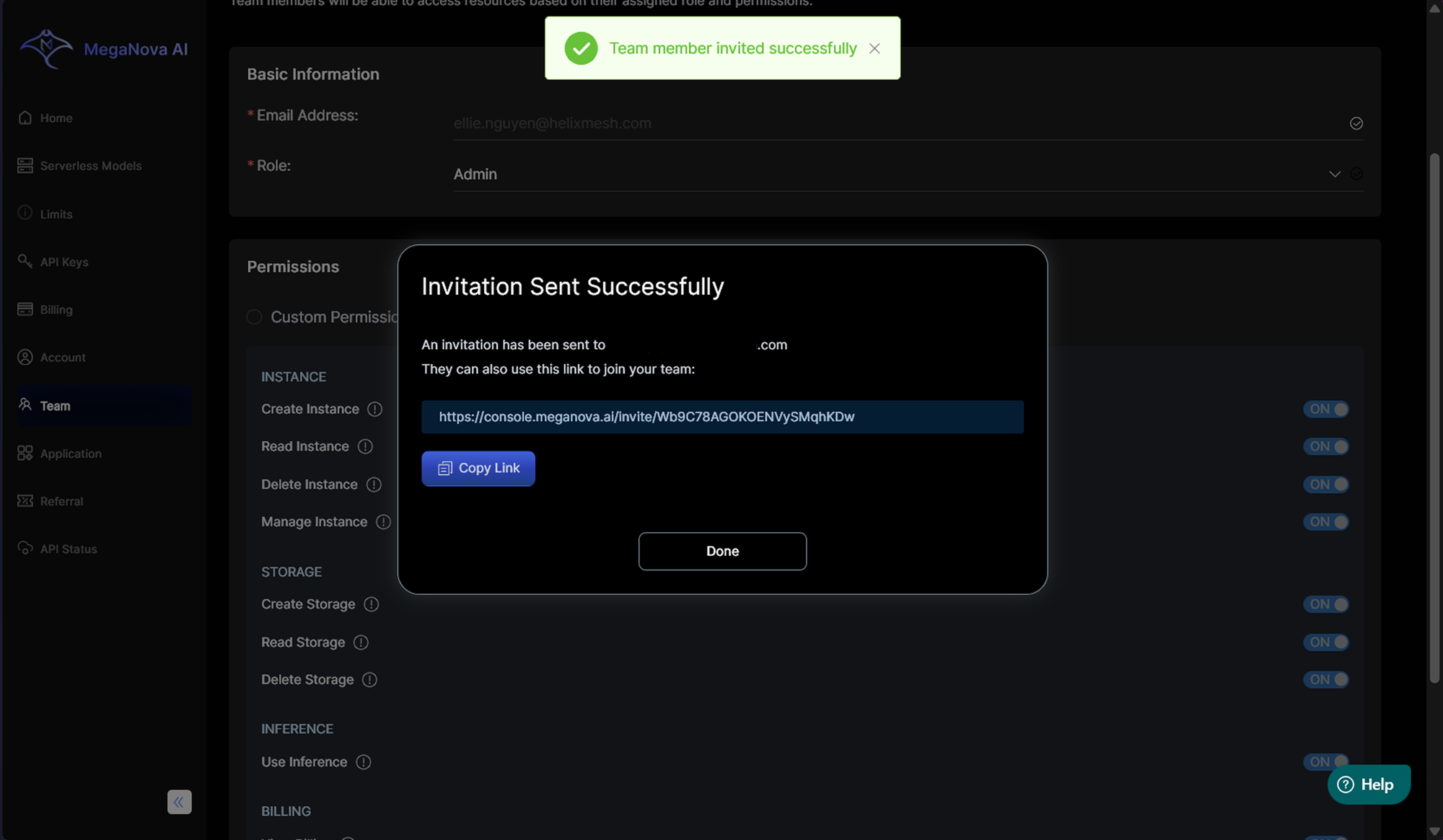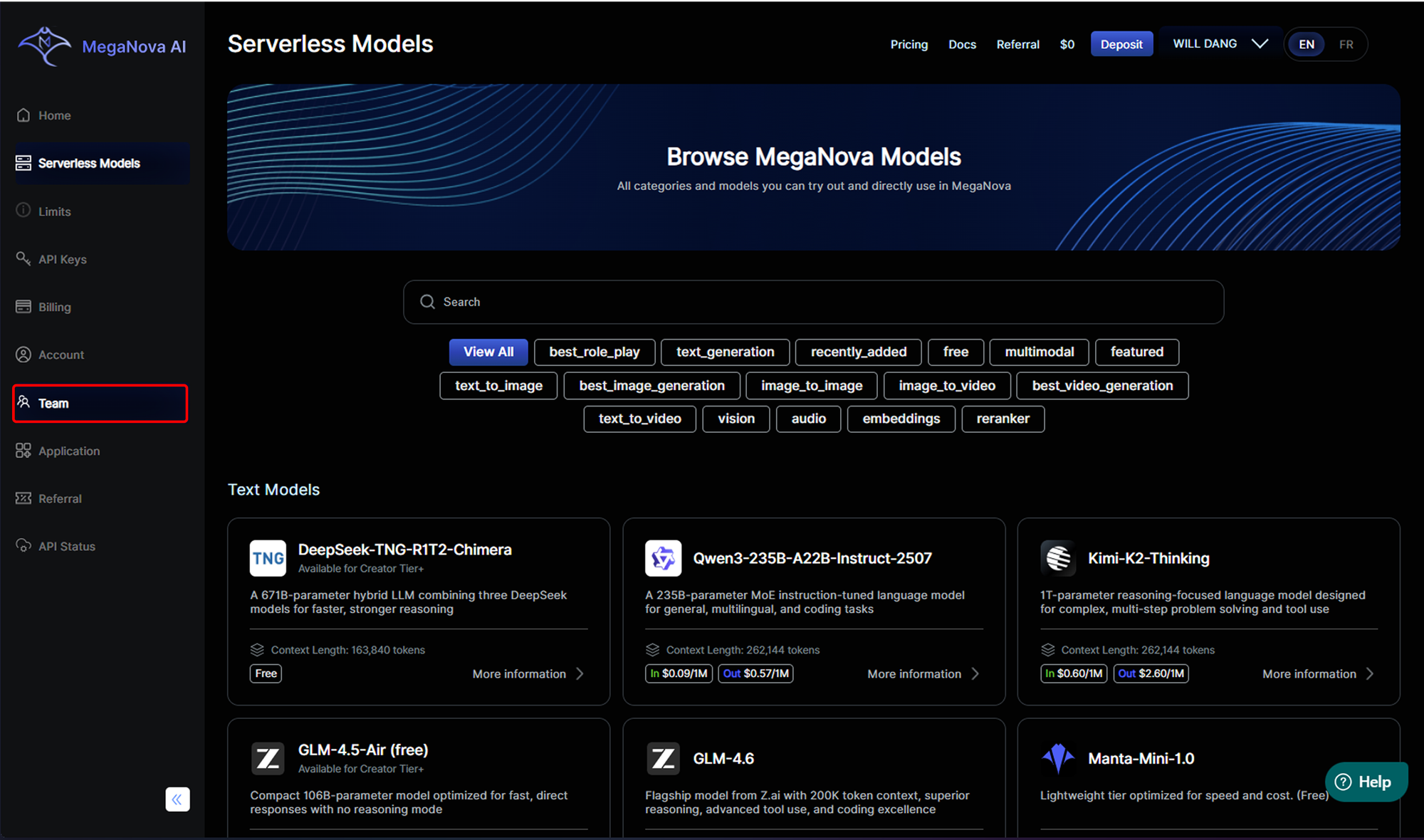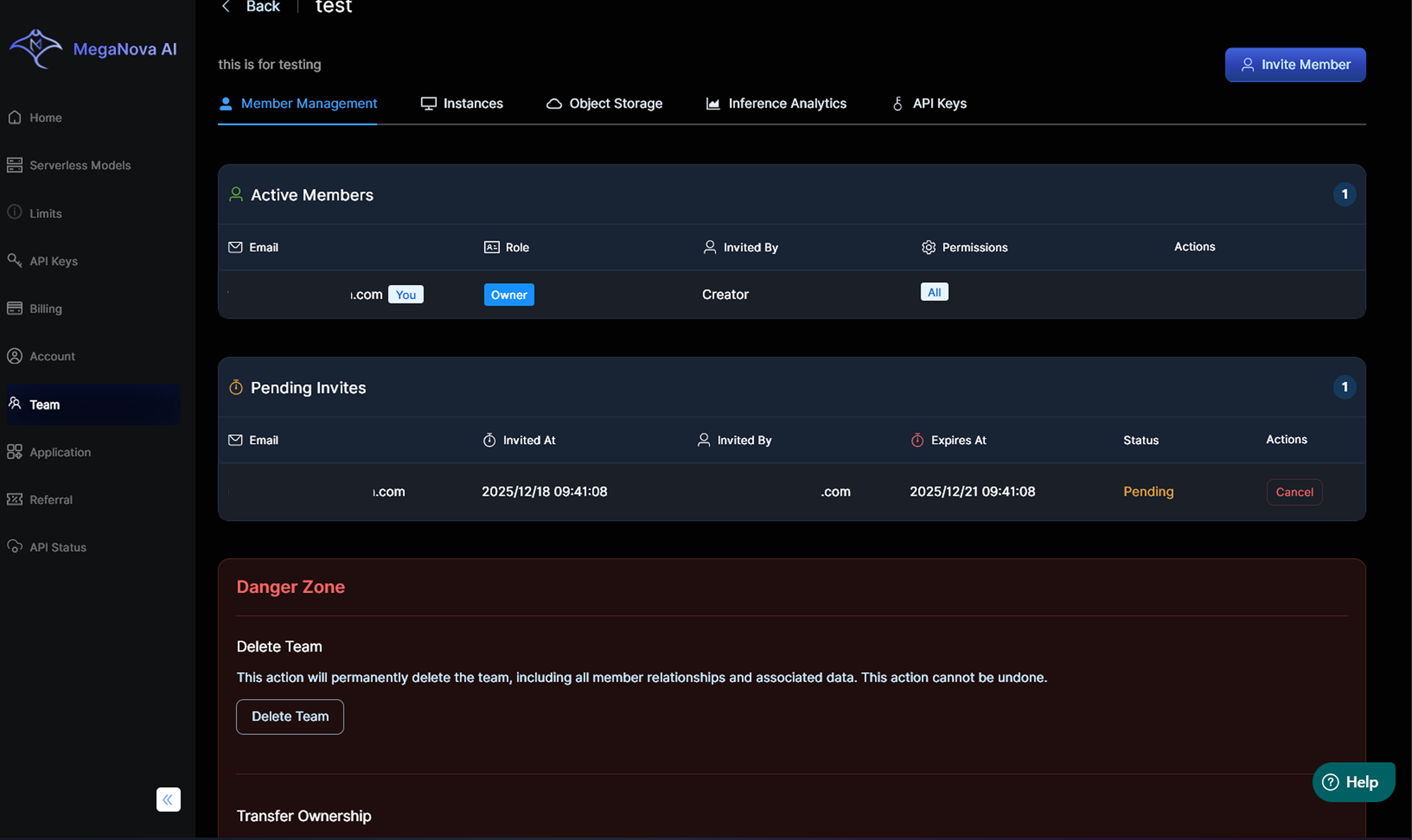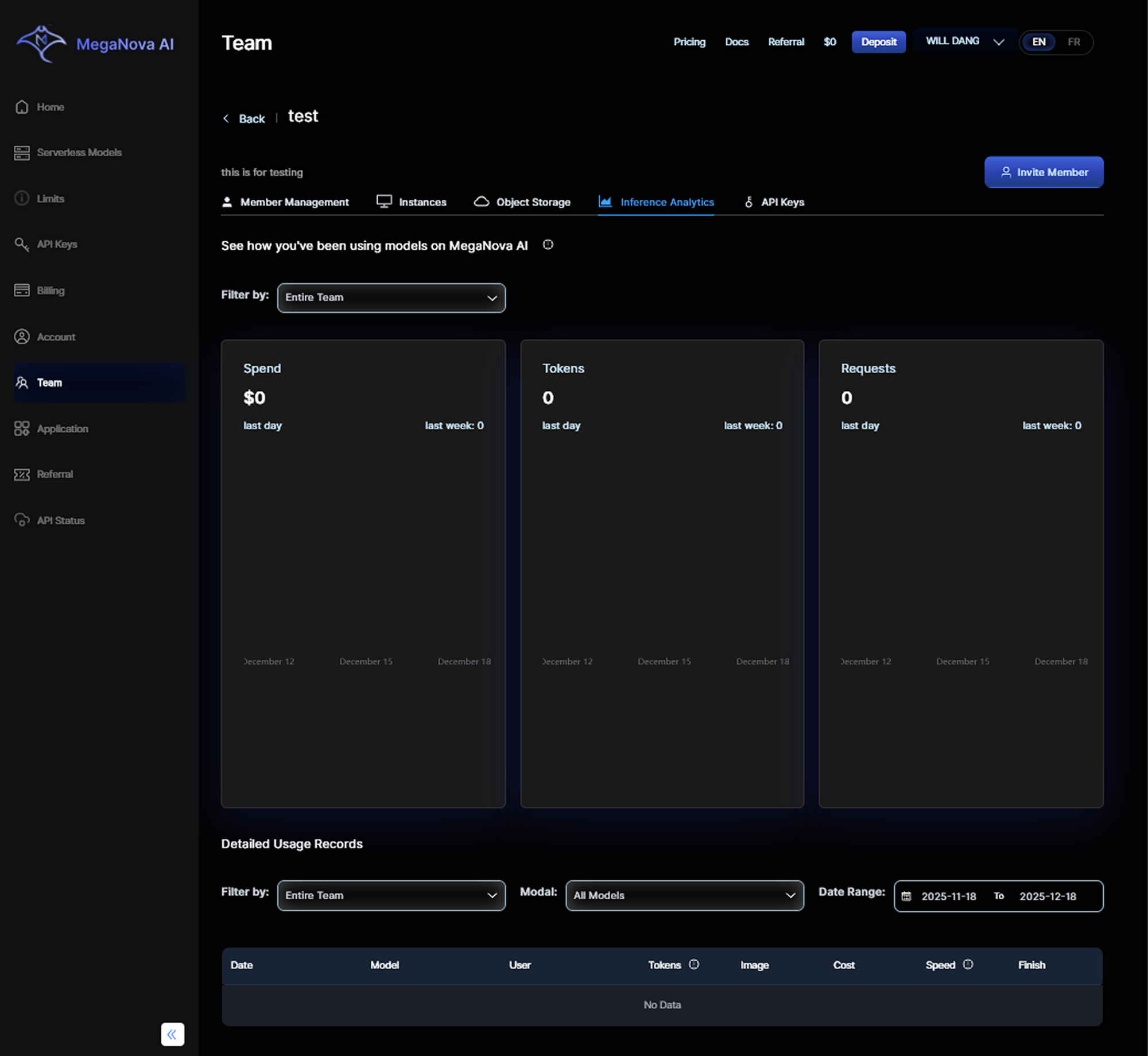 Team on MegaNova allow you to work with other users in a shared environment. You can share your inferences, manage API keys, and track usage from a single dashboard.