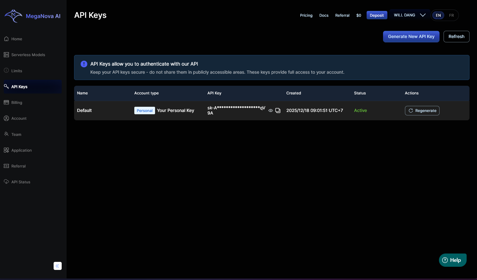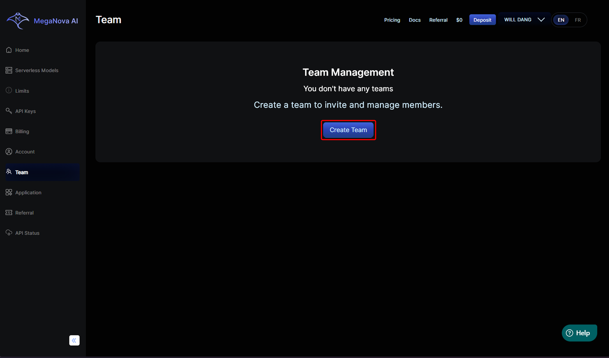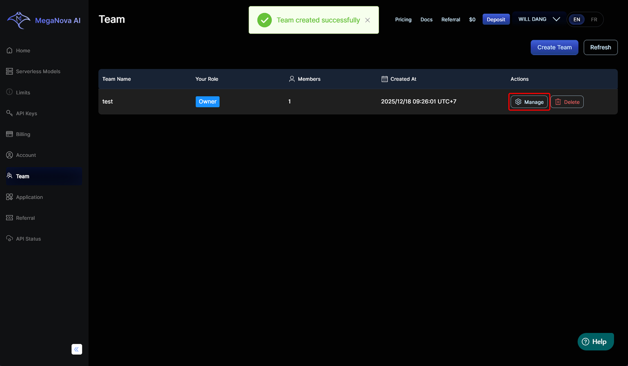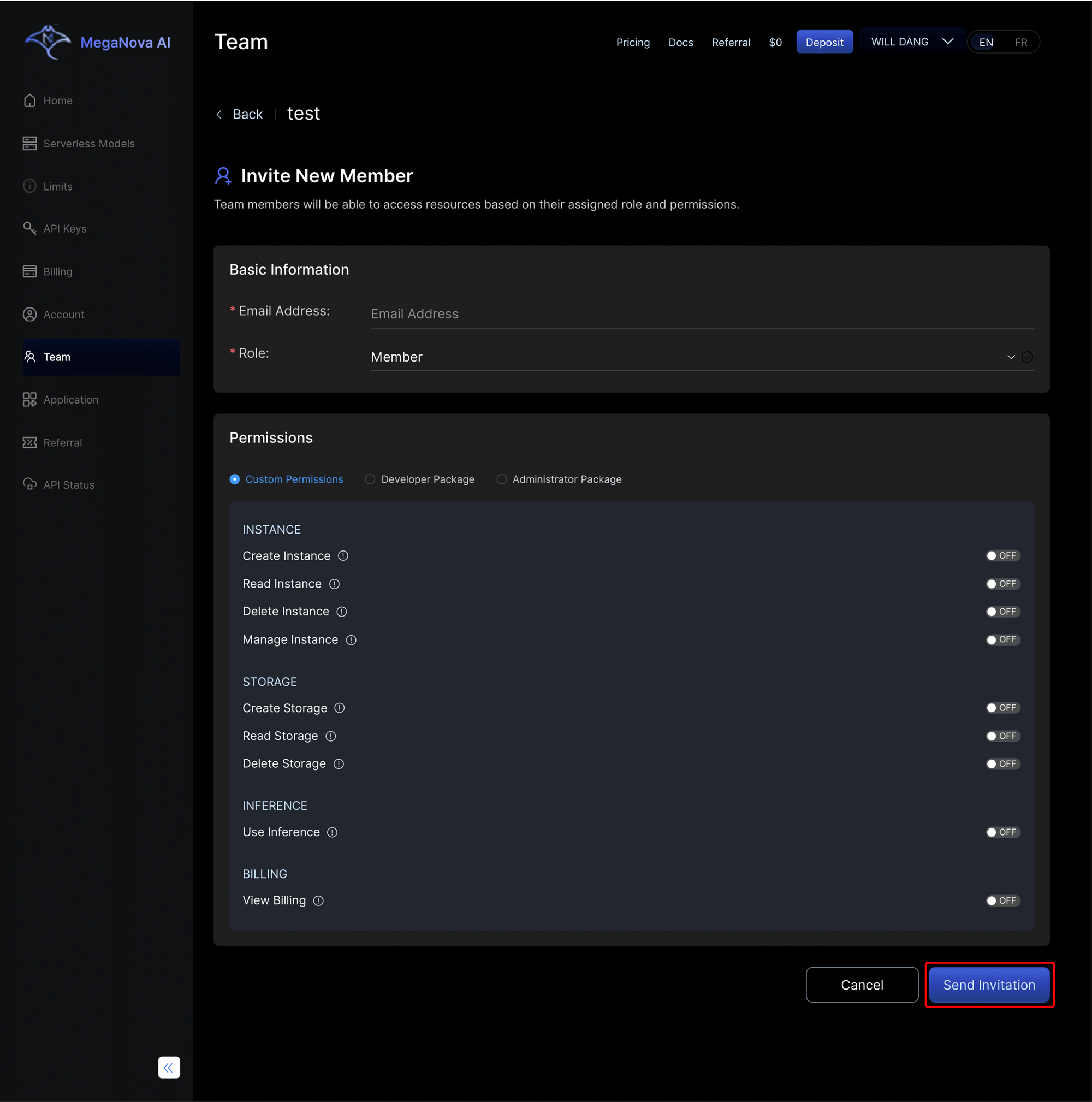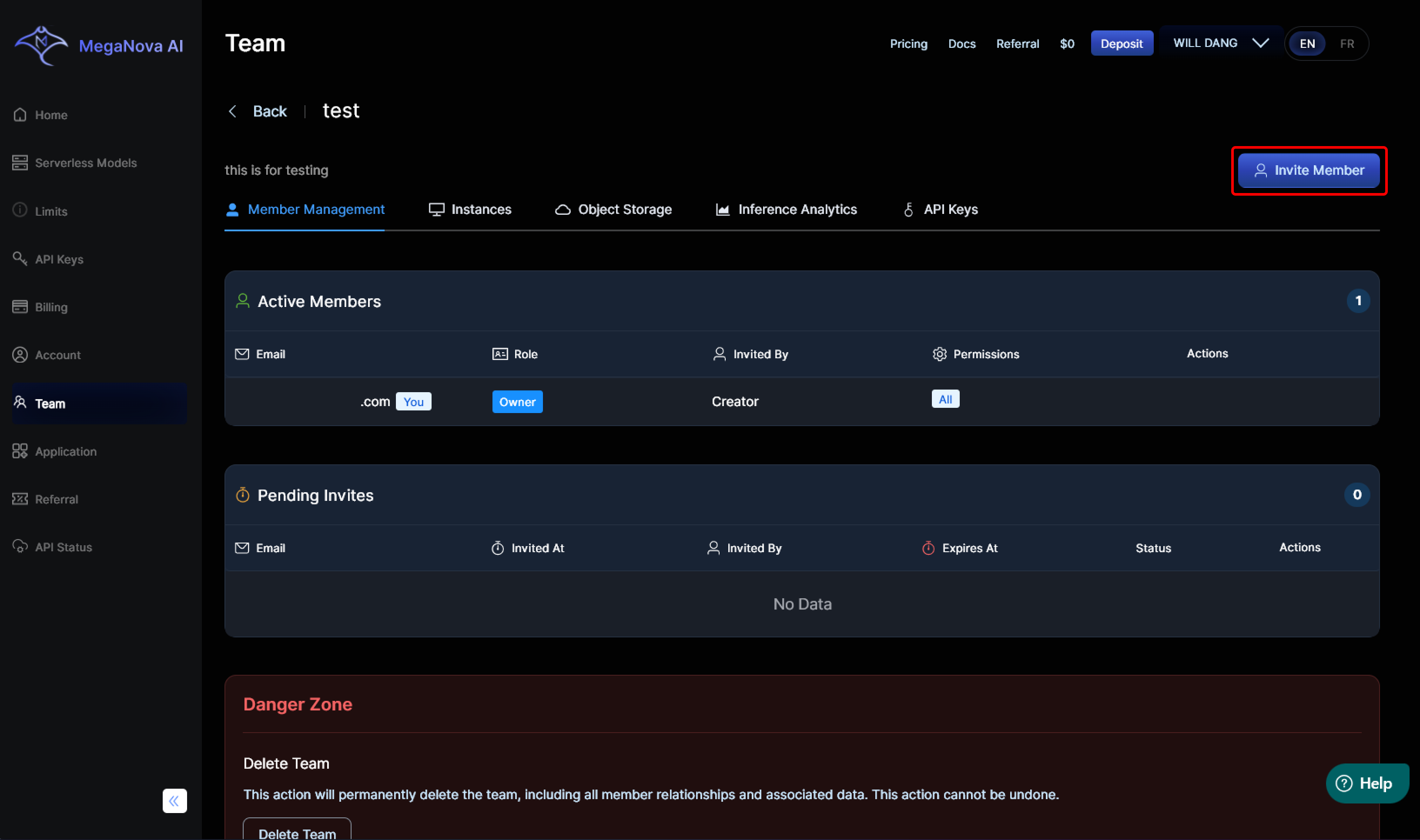 Team on MegaNova allow you to work with other users in a shared environment. You can share your inferences, manage API keys, and track usage from a single dashboard.