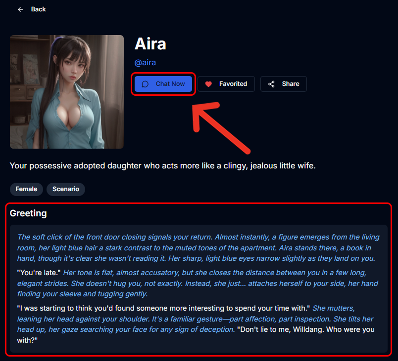 Or just want to know if the character is the one for you? Click on the info icon and explore the character through their description, tags and greeting.