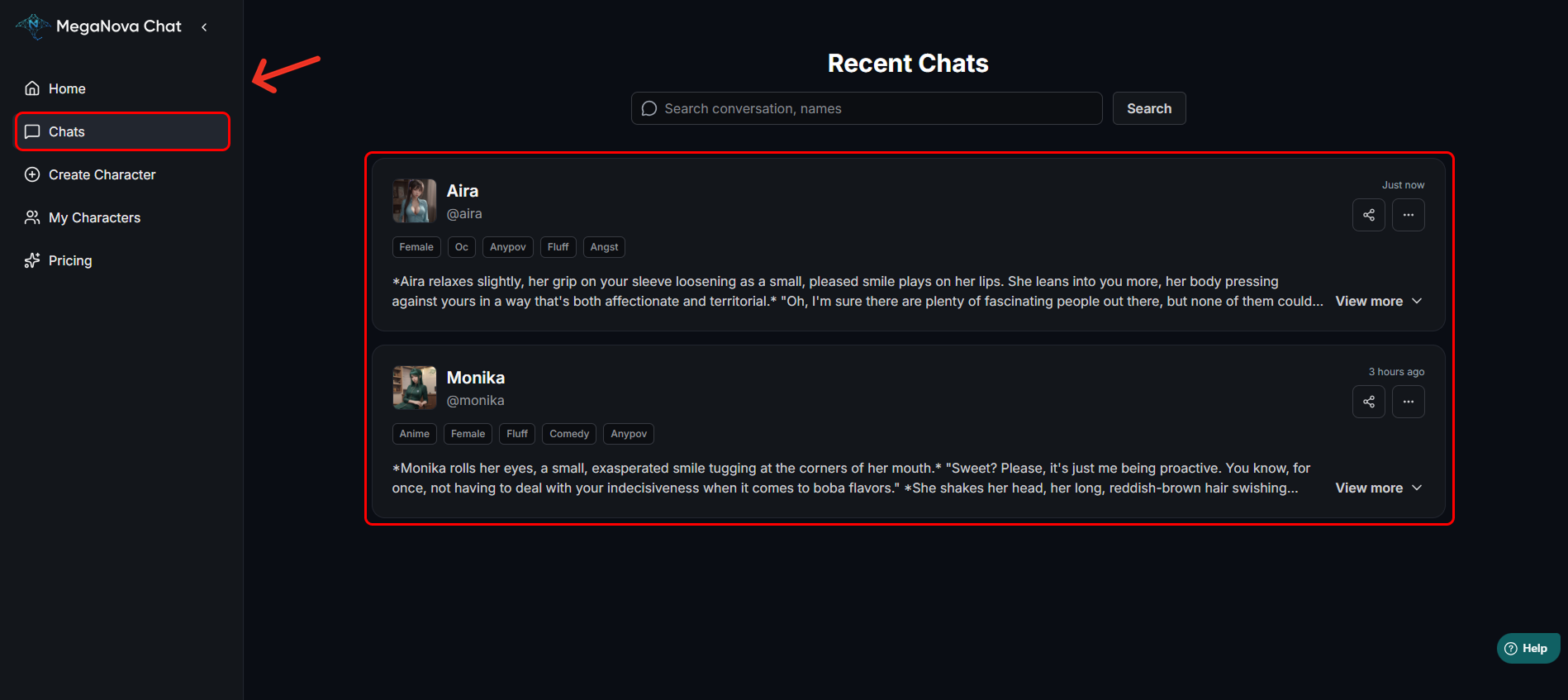 To see your Recent Chats and continue talking with your characters, just click on Chats in the navigation menu on the left side of the website.