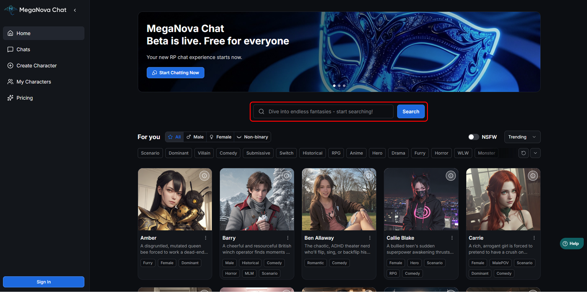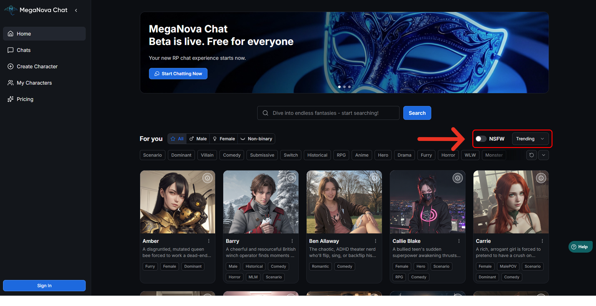 Looking for spicy characters? Simple. Just turn on NSFW mode located near the search bar.