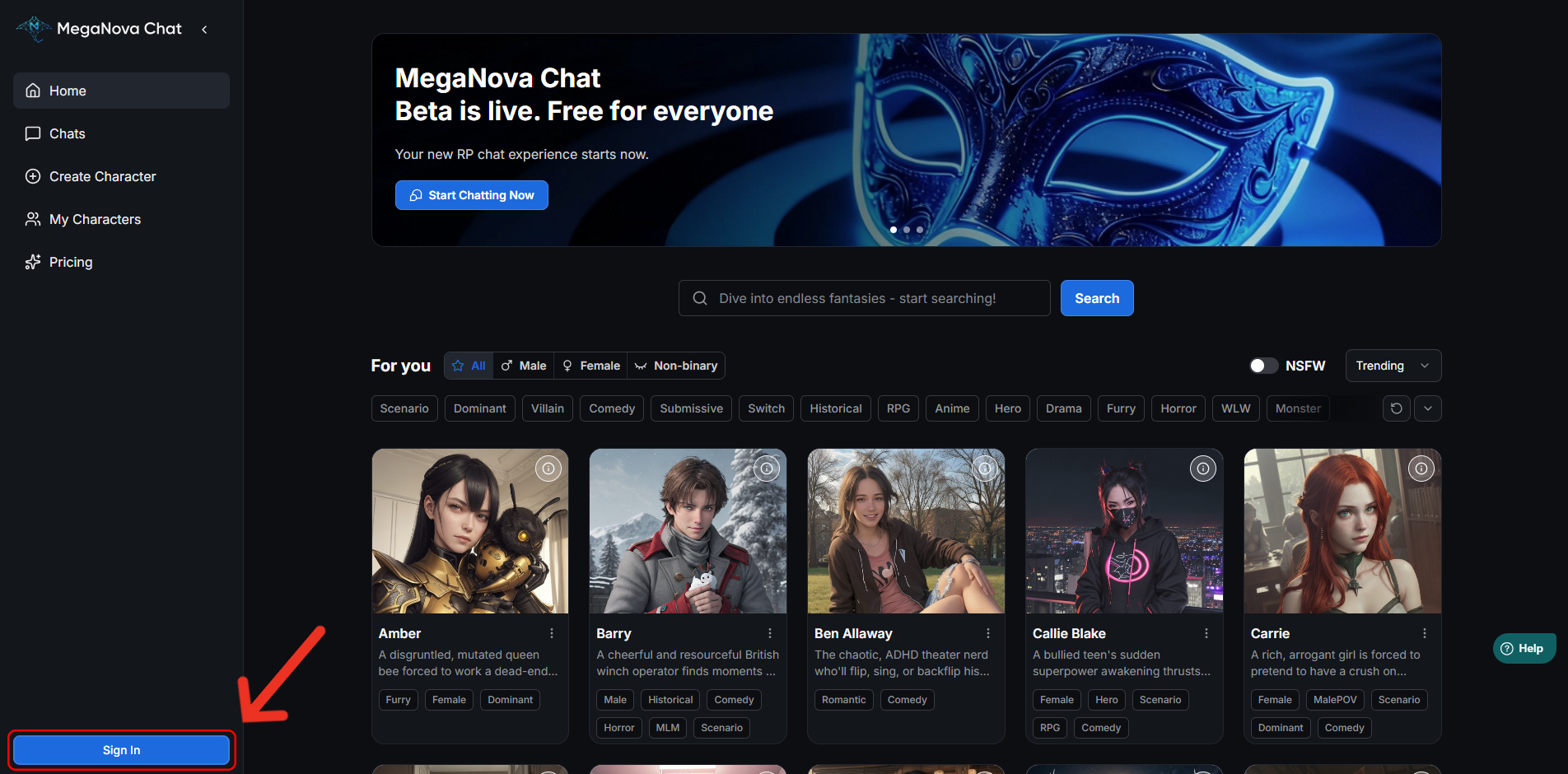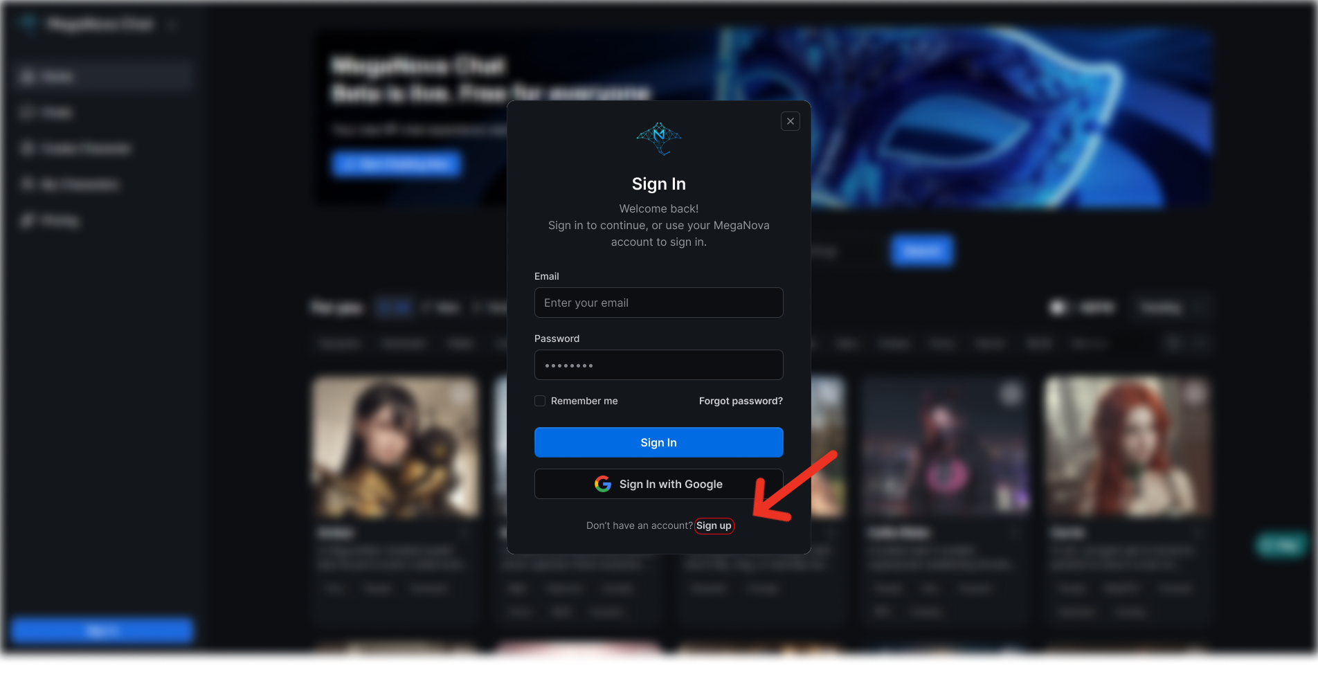 Head to the MegaNova Chat website in your browser, then choose Sign In or create your free account by Sign Up if you are not yet part of the community.
