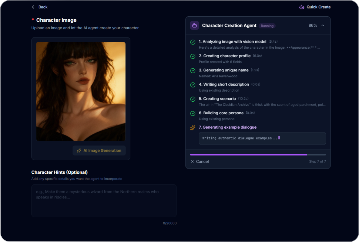 Agent Mode turns character creation into a conversation. Instead of filling out fields, you collaborate with an AI agent that guides you step by step through naming, personality, scenario, and dialogue.