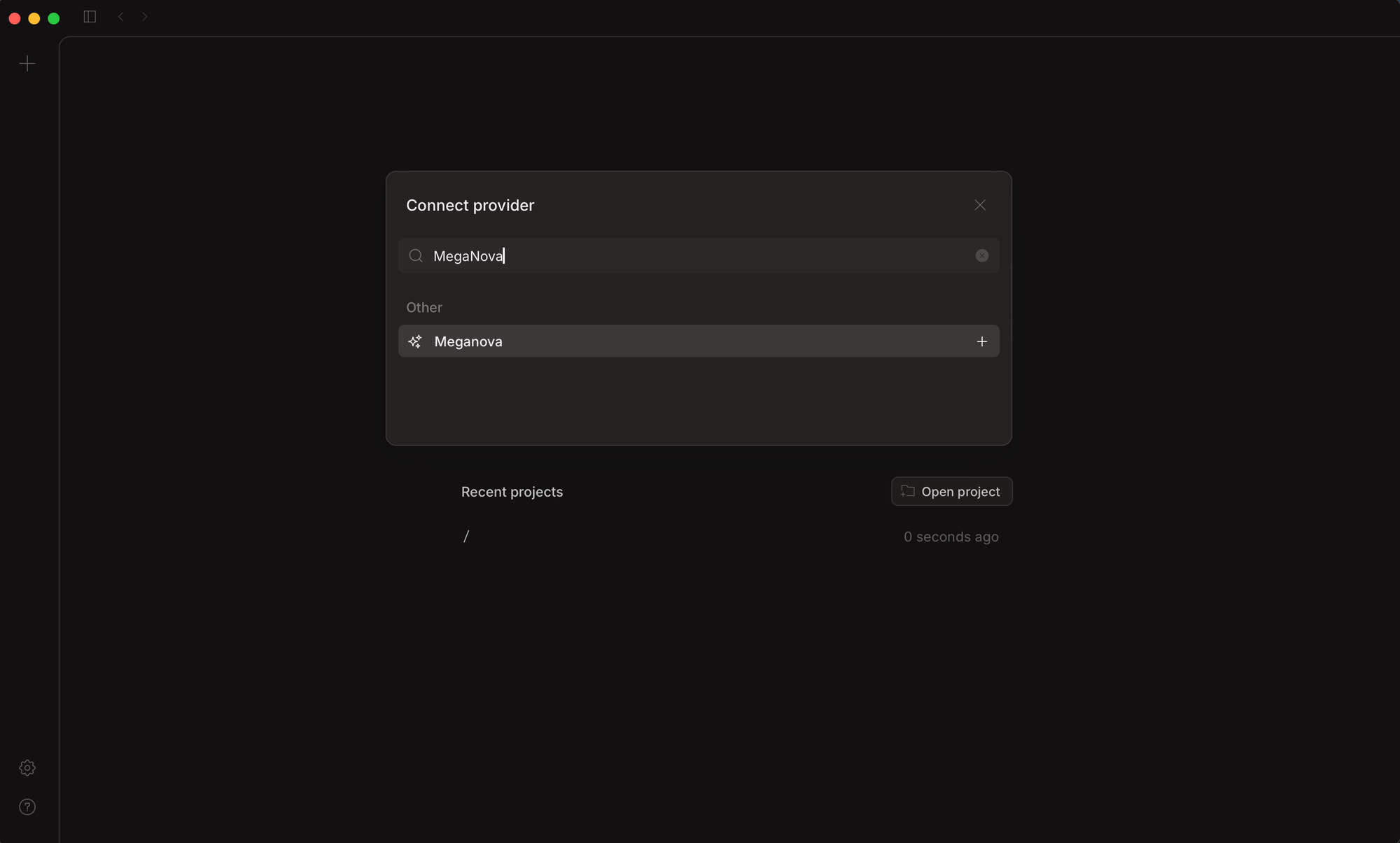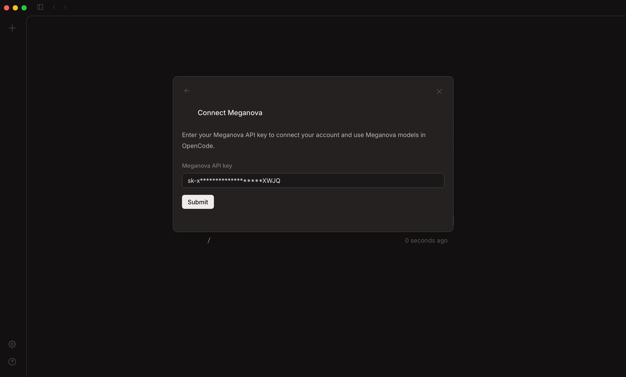 You can connect your MegaNova API key directly inside Opencode and start using MegaNova models for coding, reasoning, and structured AI workflows without additional proxy setup.