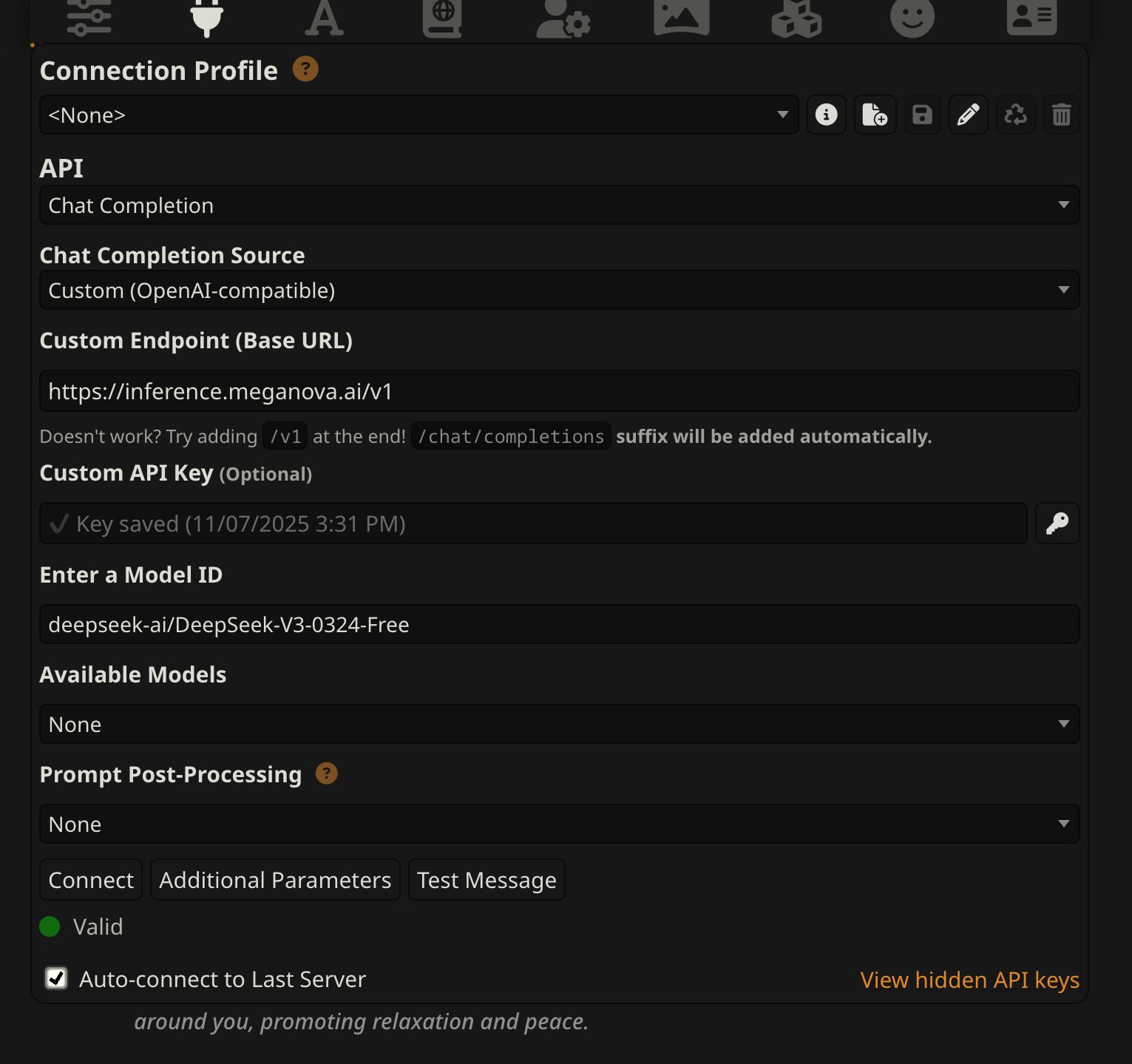 You’re all set. With MegaNova Proxy powering free DeepSeek V3-0324 on SillyTavern, you now have a fast, stable, and high-performance setup that rivals paid APIs.
