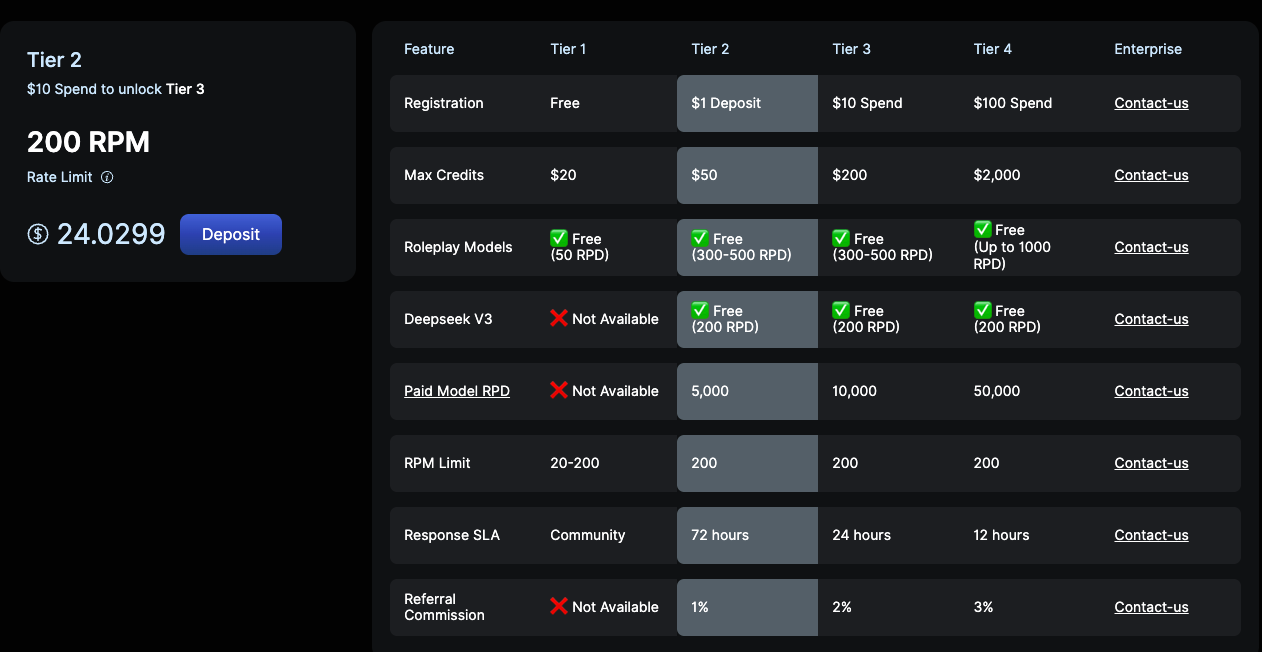 Step 3 - Deposit $1 to unlock the Tier 2 (Creator) plan. This gives you access to DeepSeek V3-0324 model and other premium-tier models.