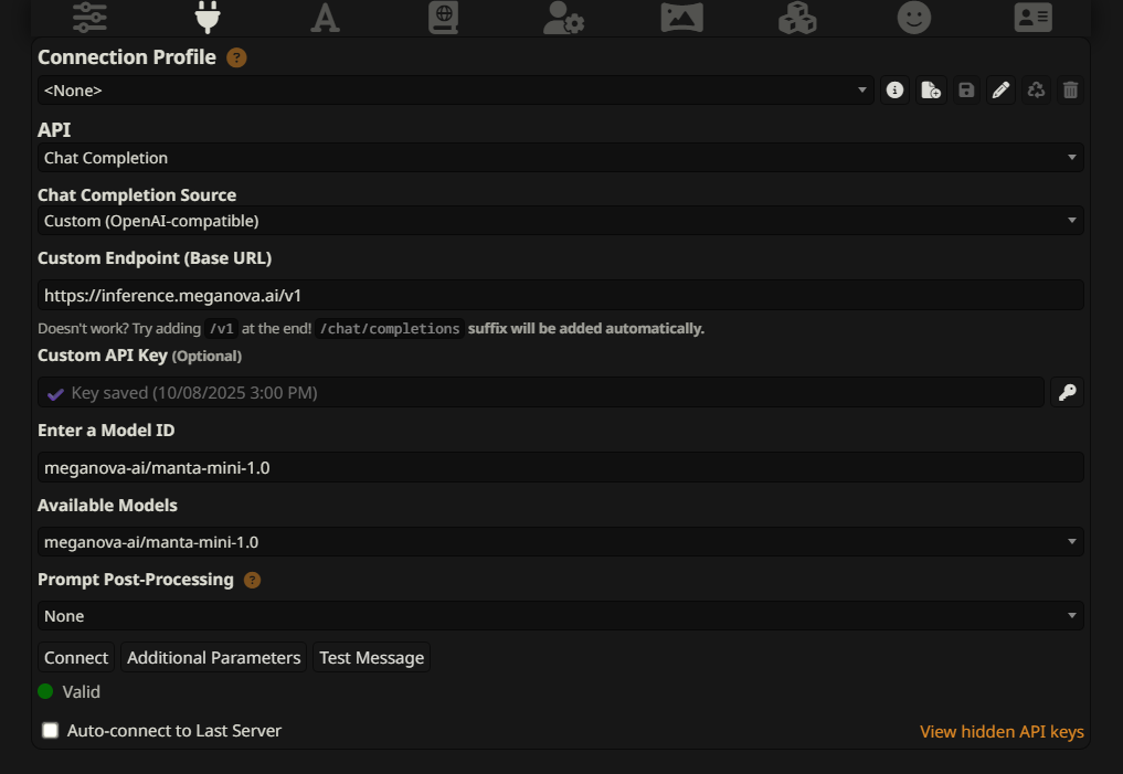 SillyTavern powers immersive, creative interactions with AI — and now, connecting it to MegaNova’s free API takes the experience to the next level, delivering fast, private, Manta-backed roleplay with zero setup headaches.