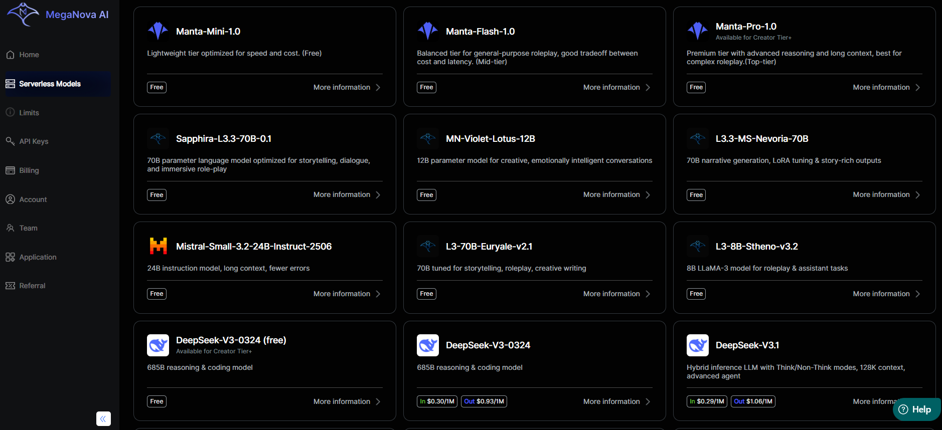 MegaNova supports a wide range of open-weight LLMs, many available for free like: