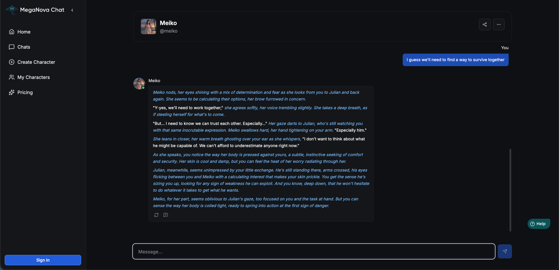 Sign up at Free MegaNova Chat Beta and experience roleplay without friction — your characters, your world, your story, all in one place.