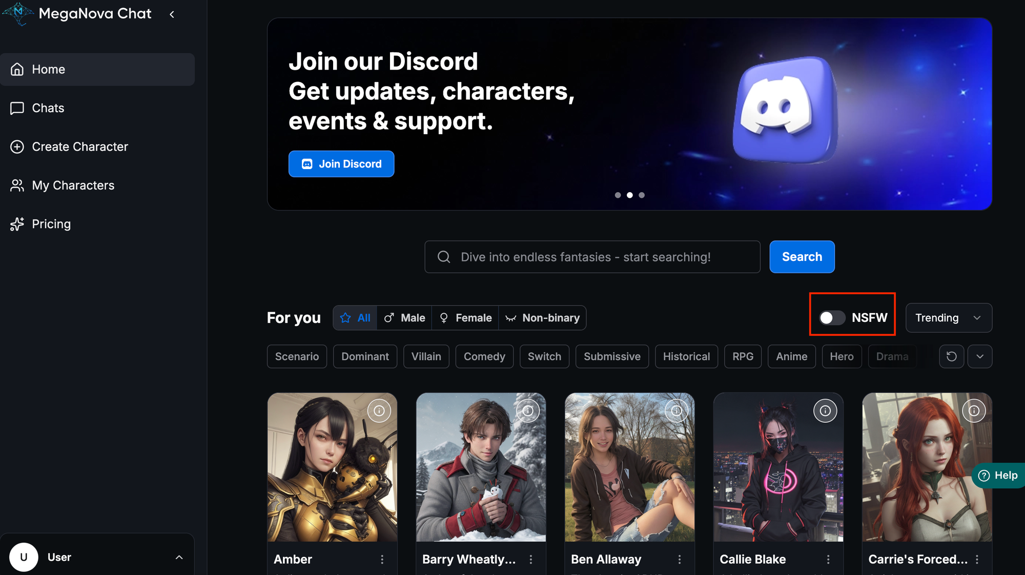 MegaNova Chat has simple NSFW toggle to allow users' select their NSFW preference and has a stable, consistent experience.