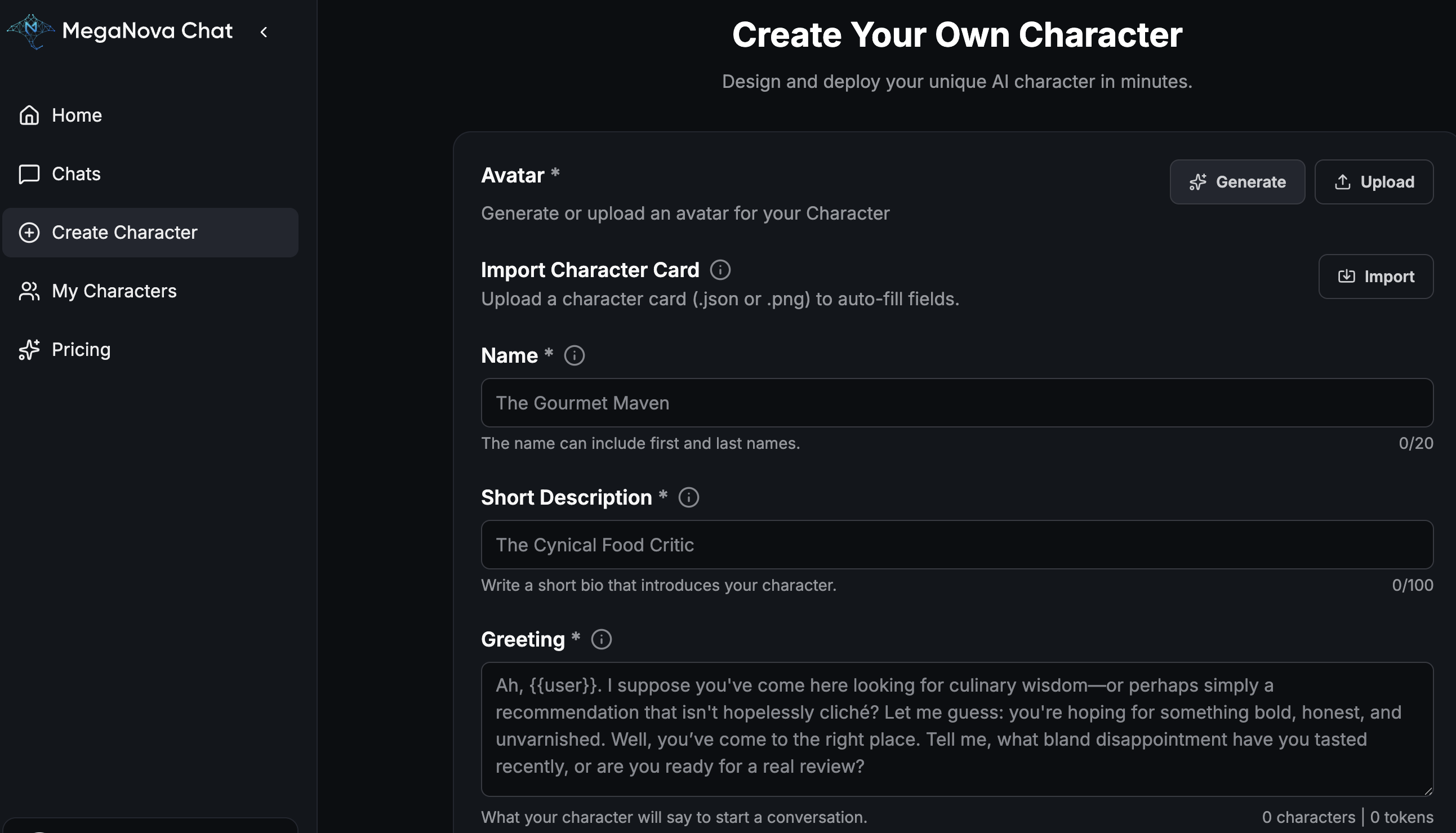 MegaNova Chat supports PNG/JSON imports, saved drafts, and deeper customization for people who enjoy fine-tuning personality behavior.