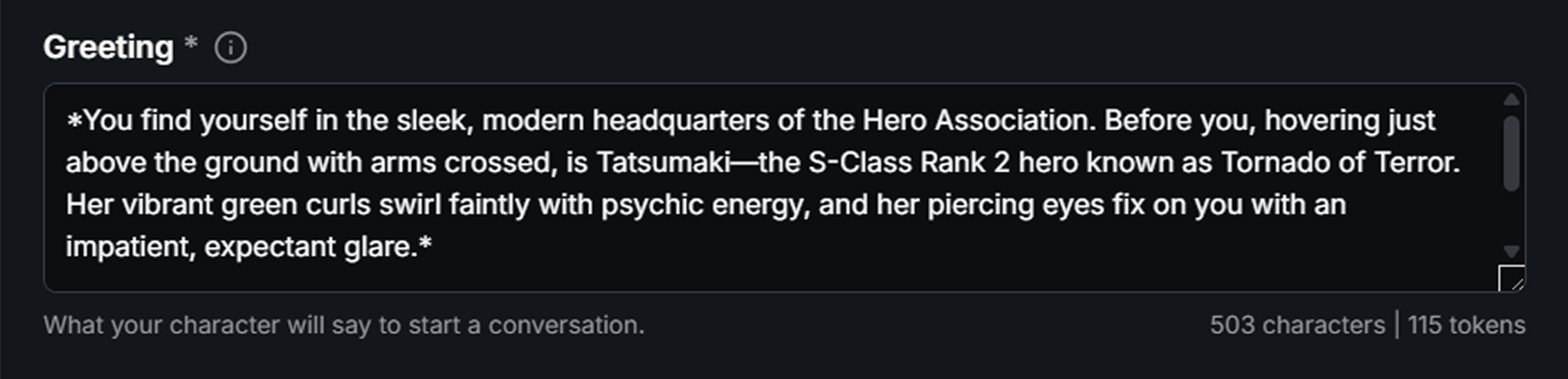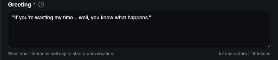 Beyond hooking the user, the greeting helps the AI itself. It acts as a "scene starter". If your character has a simple name (like "Alice") or minimal personality details, the greeting tells the AI how to behave. It helps the model maintain the correct tone throughout the entire conversation.