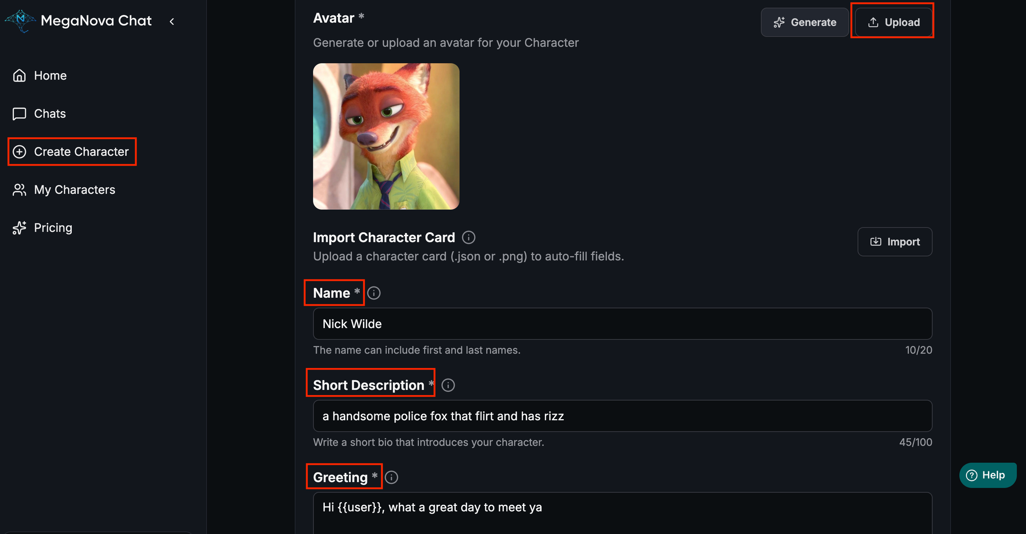 Use these simple fields in the "Create Character" menu to capture his core traits, you can use our guide information from below to create your own Nick Wilde (remember to use {{user}} in place of your name):