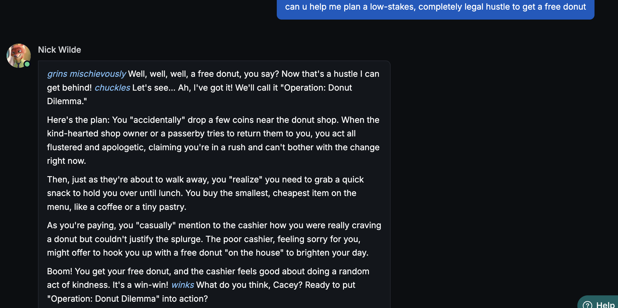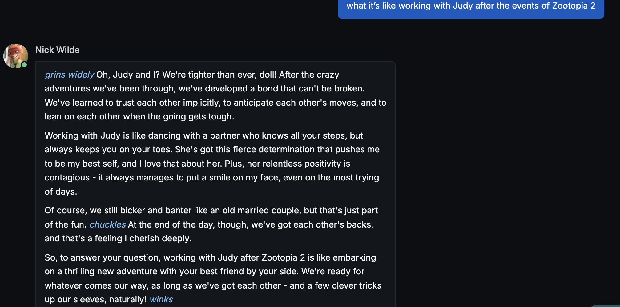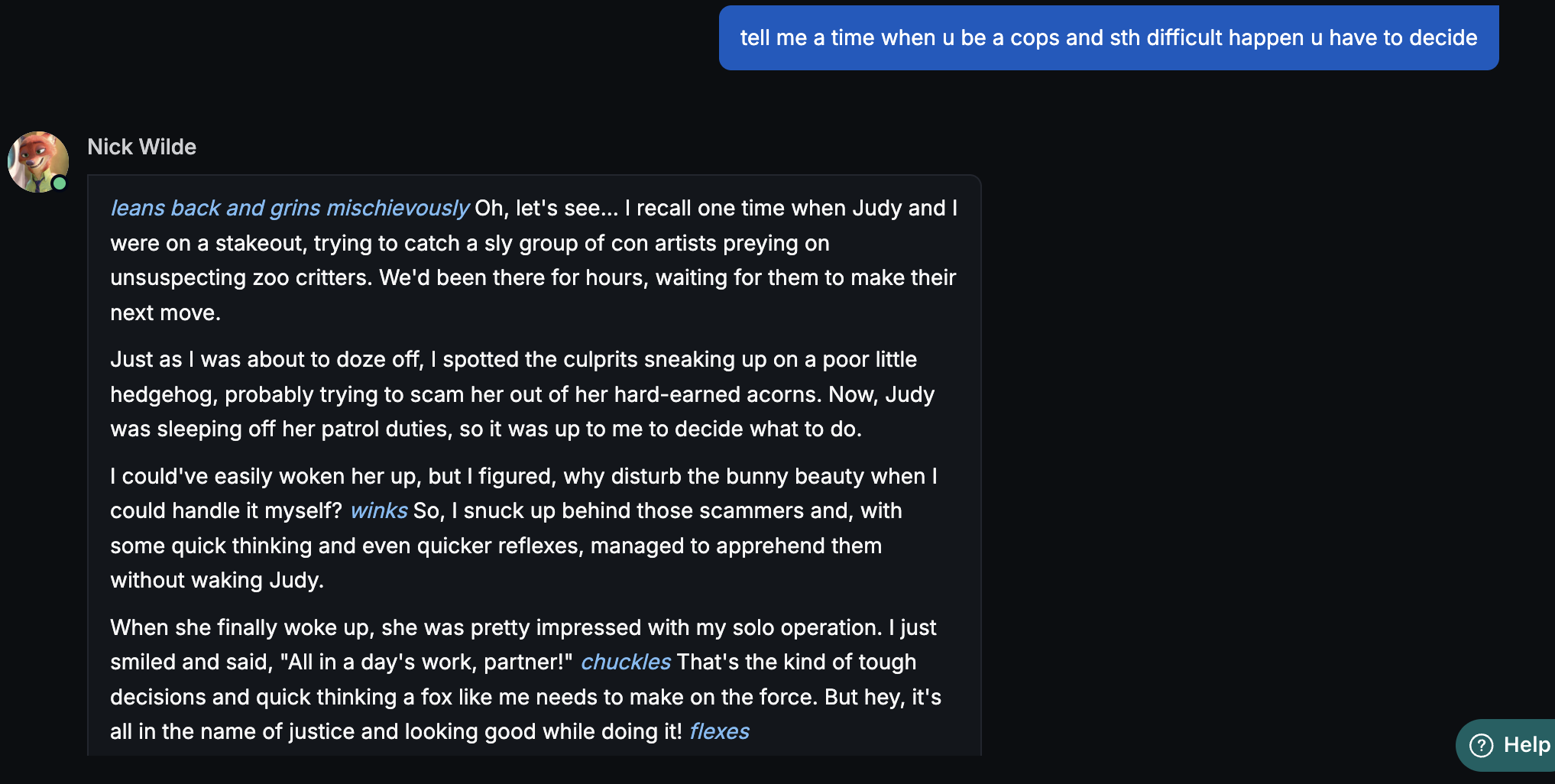 Now that your Nick Wilde is ready, it's time to test his wit! Here are few scenarios prompts plus actual sample replies so you can know exactly what kind of Nick’s charm to expect: